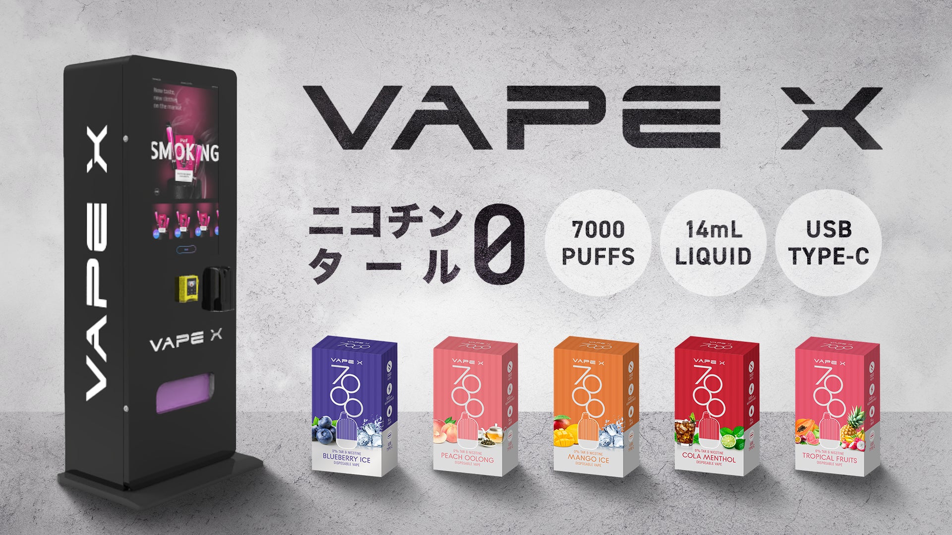 自販機で販売するVAPE製品(使い捨てタイプ)はブルーベリー、コーラ、ピーチウーロン、マンゴー、トロピカルフルーツの計5種類のフレーバーをラインナップしており、1本あたり税込3,000円で