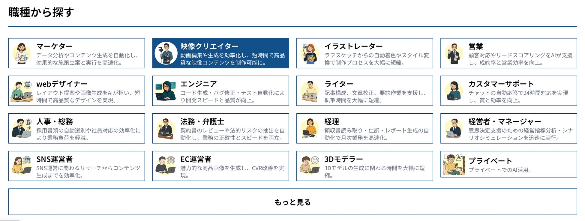 「職種×業務課題」の軸で探せる:業務課題を解決できるAIツールをピンポイントで探せます。