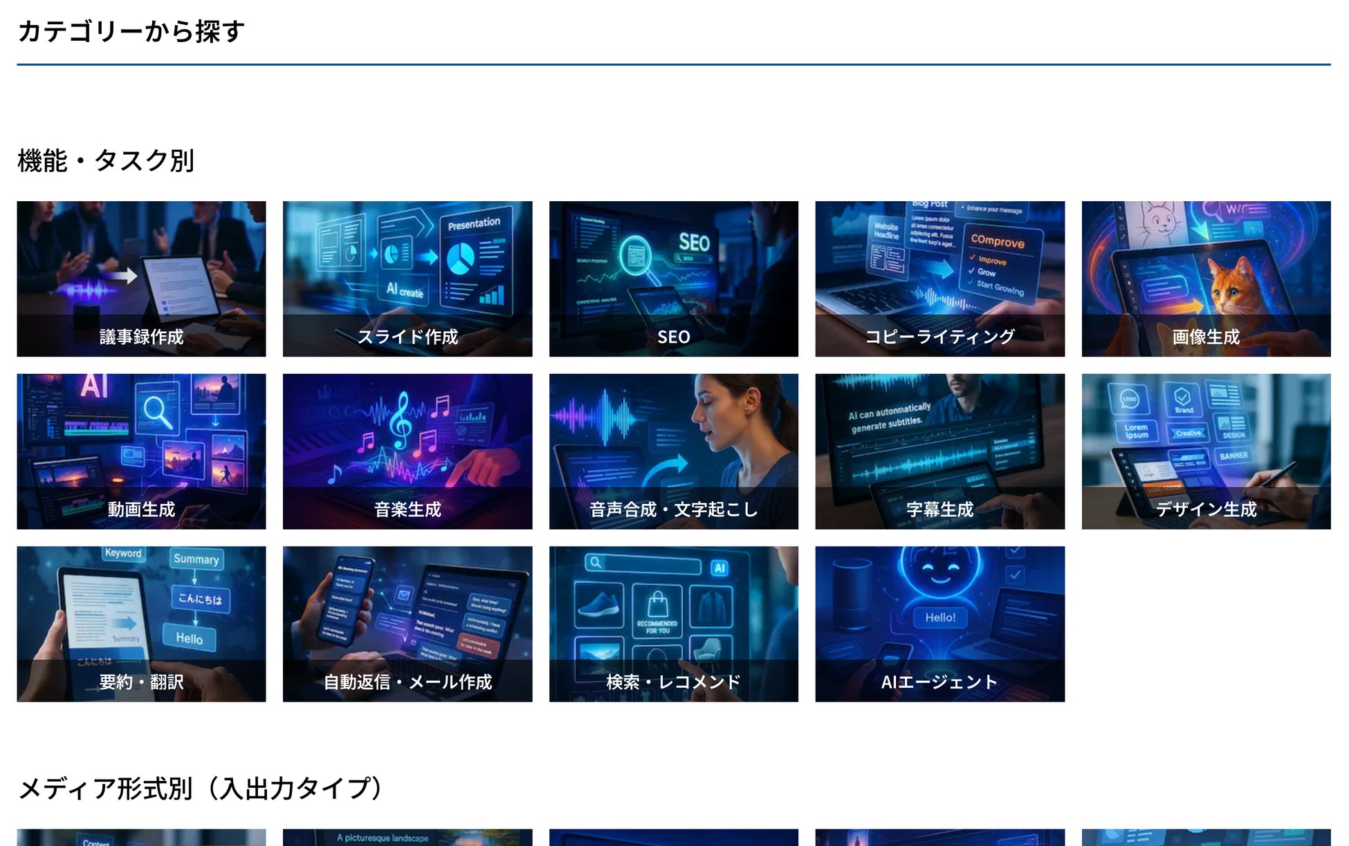網羅的なデータベース:国内外の主要なAIツールをカテゴリ別に整理し、検索性を高めています。
