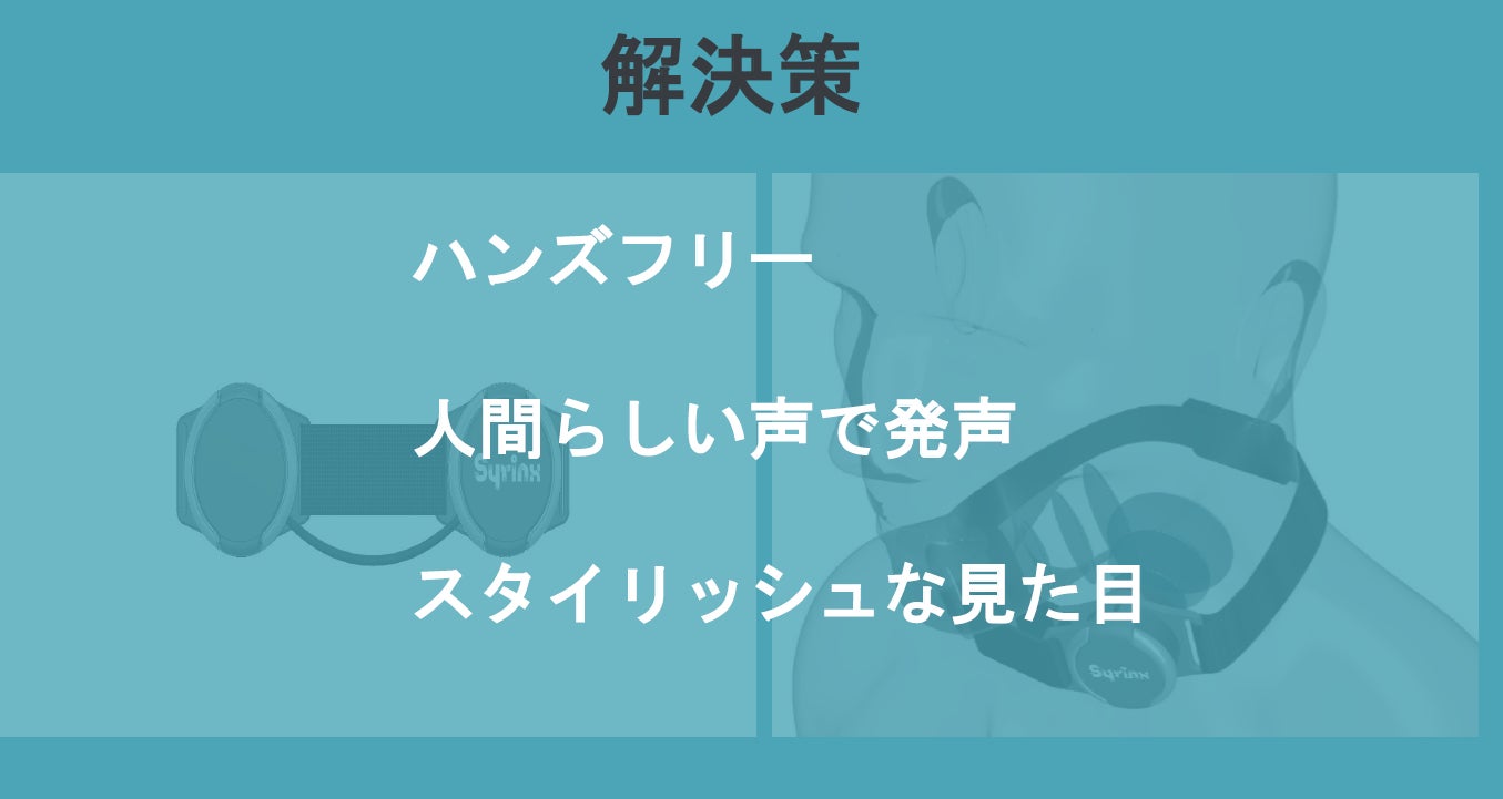 喉頭がんなどの病気により、毎年世界中で約300,000人の人が声を失っています。日本では年4,000人が該当しています。喉頭あるいは声帯をなくした人々は、他の人のように音を生み出すことはできません。そしてほかの人たちとコミュニケーションをとることは、日々の生活を送るうえでなくてはならないものなのです。