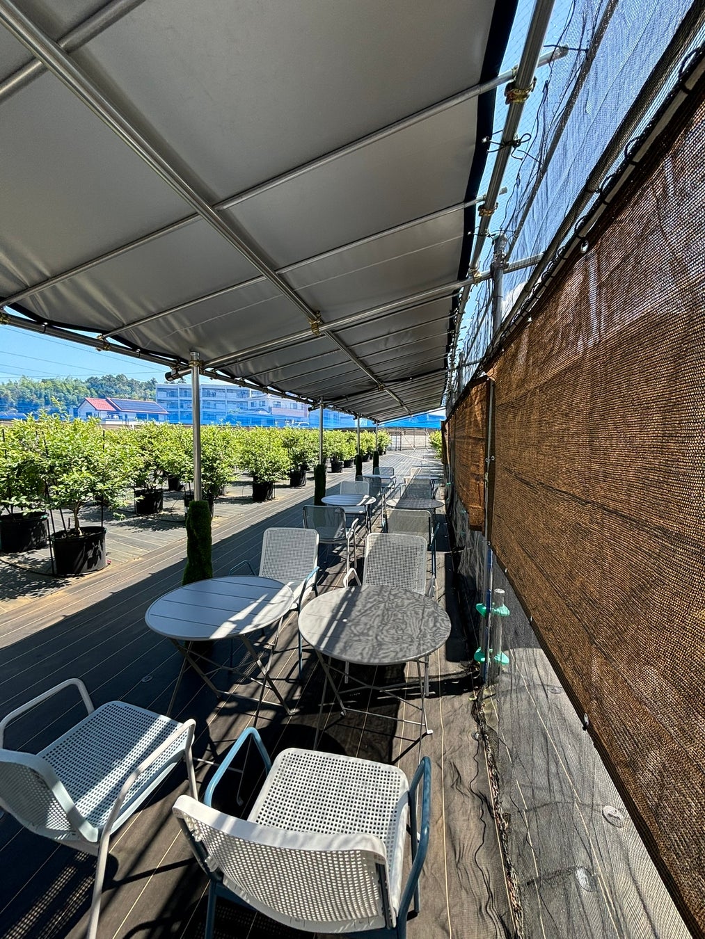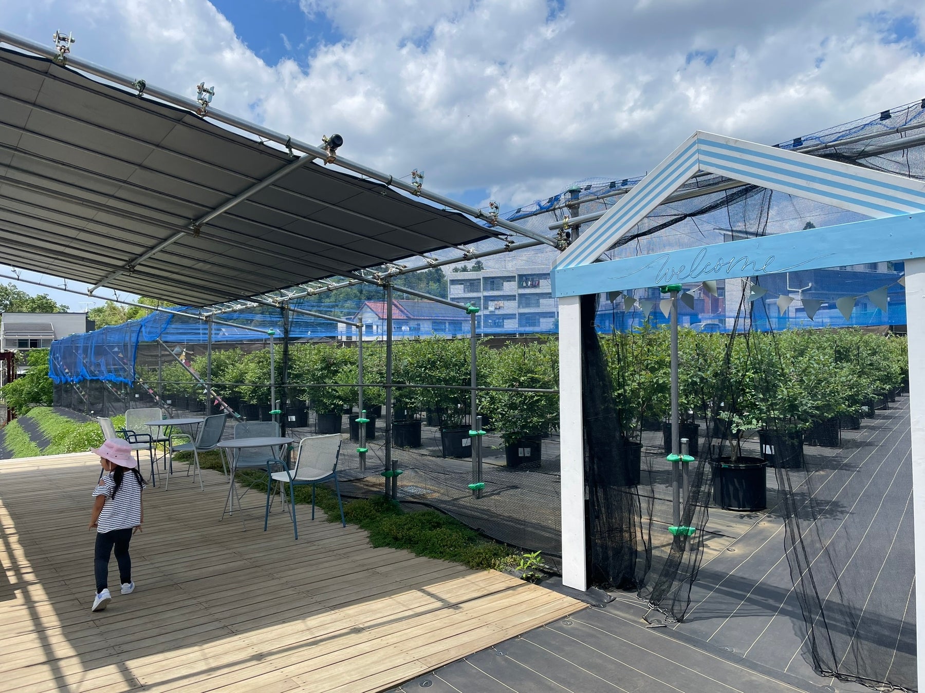 近年の夏はとにかく暑い。だからこそ、ブルーベリー狩りをゆったり楽しむには、日陰で休めるスペースがとても大切です。