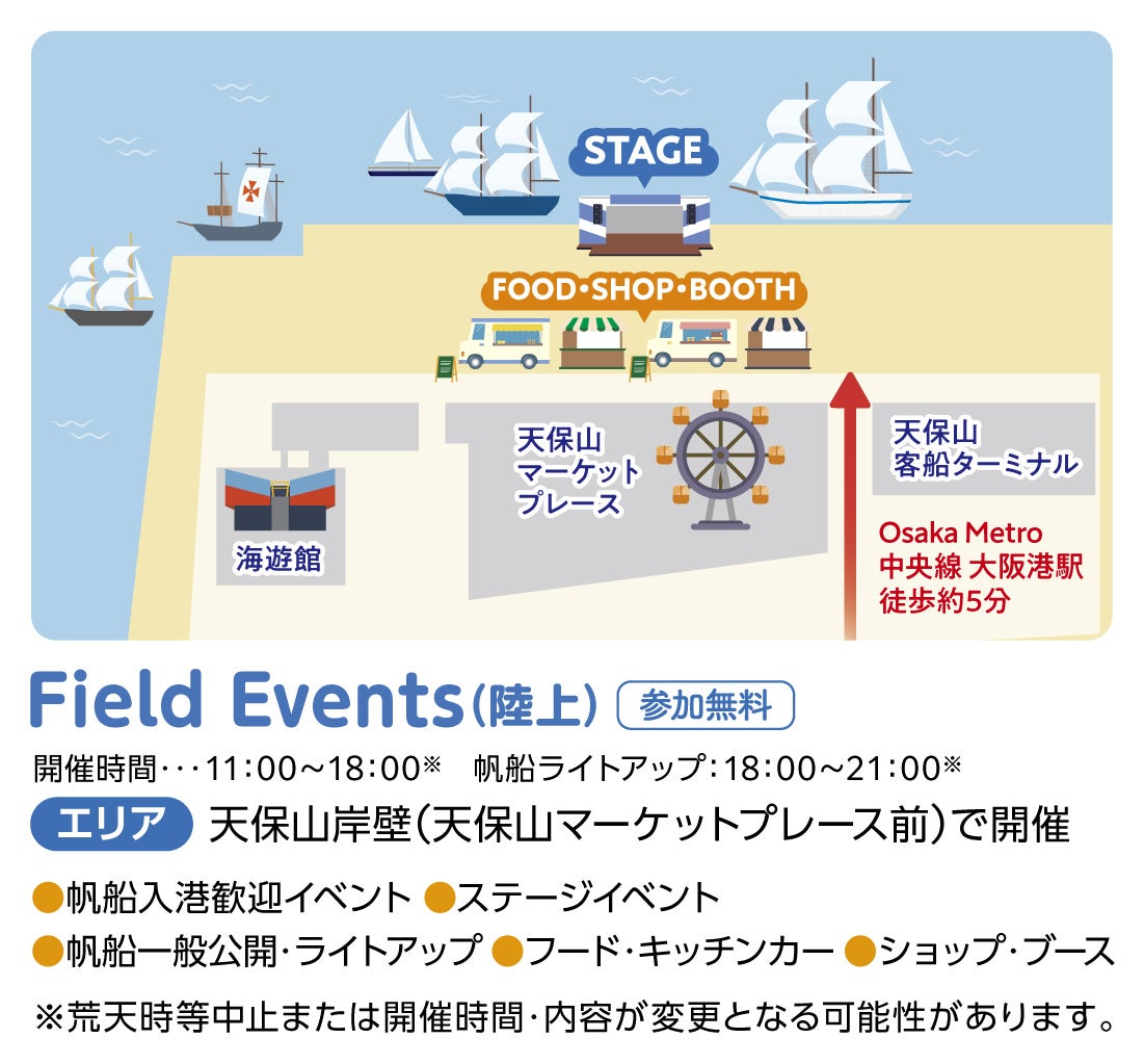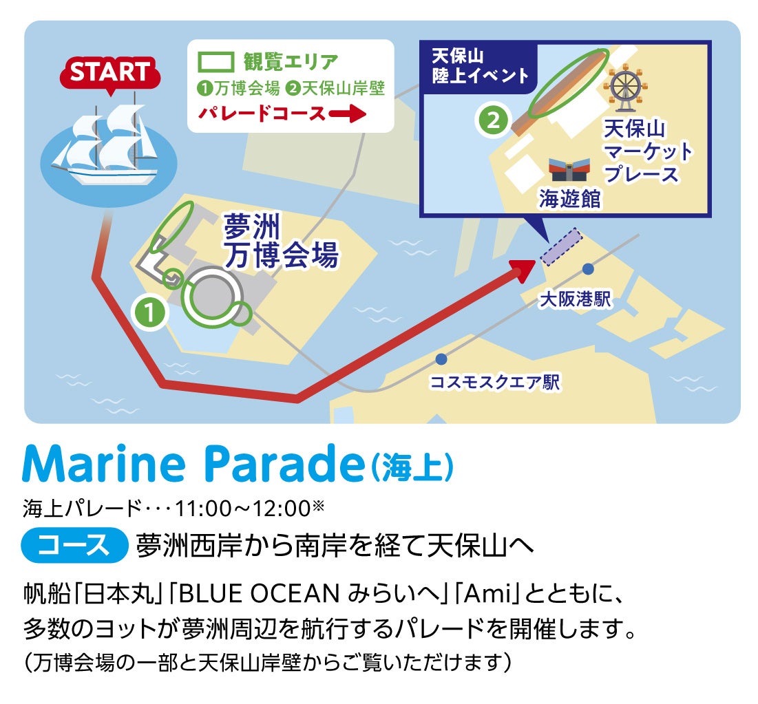 | 4.実施内容 | 【メインイベント】 「海上パレード」 ※荒天中止 帆船「日本丸」「BLUE OCEAN みらいへ」「Ami」と多数のヨットが隊列をなし、夢洲の万博会場沖の海上を航行パレード(11:00~12:00)いたします。 「陸上イベント」 天保山岸壁、天保山マーケットプレイス前にて、ステージイベントや帆船一般見学会、キッチンカーやショップなどのブースが予定されています。詳細はイベントサイトにて更新予定です。 |