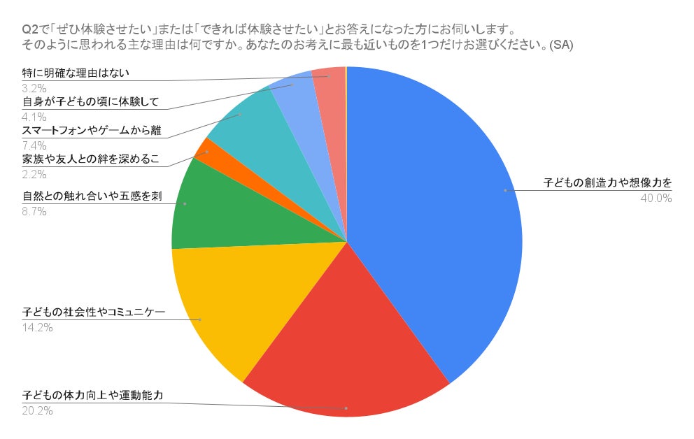非デジタルな遊びを体験させたい理由として、「子どもの創造力や想像力を育むと思うから」(40.0%)が最も多く、次いで「子どもの体力向上や運動能力の発達につながると思うから」(20.16%)、「子どもの社会性やコミュニケーション能力を育むと思うから」(14.17%)が上位を占めています(Q3)。これらの遊びが子どもの心身の発達に多角的に貢献すると期待されていることがわかります。また、「スマートフォンやゲームから離れる時間も必要だと思うから」(7.40%)という回答もあり、デジタルデトックスの観点も意識されています。
