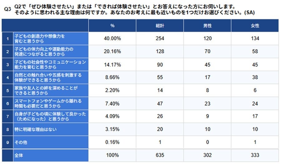 設問2で「ぜひ体験させたい」または「できれば体験させたい」とお答えになった方にお伺いします。そのように思われる主な理由は何ですか。最もあてはまるものを1つだけお選びください。