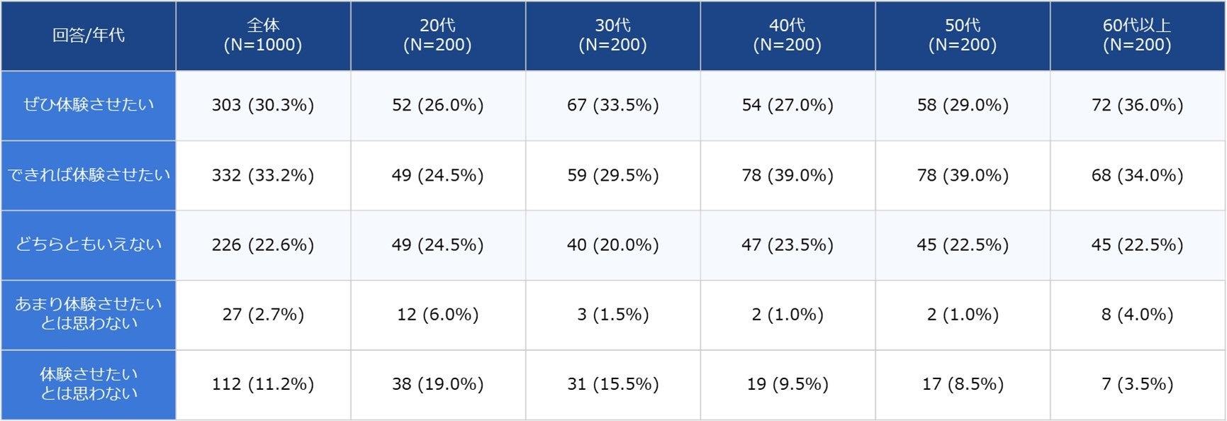 逆に、「あまり体験させたいとは思わない」「体験させたいとは思わない」と回答した人の合計は、20代で25.0%と最も高く、年代が上がるにつれて低くなり、60代以上では7.5%となります。 この結果から、特に若い世代である20代において、子どもに非デジタルな遊びを体験させることへの意欲が他の世代と比較して低い傾向があることが示されました。