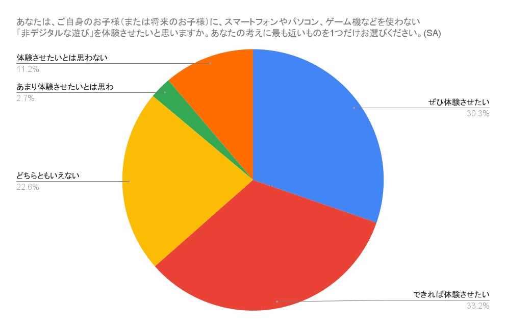 「ぜひ体験させたい」(30.3%)と「できれば体験させたい」(33.2%)を合わせると63.5%となり、過半数の人が子どもに非デジタルな遊びを体験させたいと考えていることがわかります。これは、デジタルデバイスが普及した現代においても、実体験を伴う遊びの重要性が認識されていることを示しています。 一方で、「体験させたいとは思わない」(11.2%)、「あまり体験させたいとは思わない」(2.7%)という否定的な意見も合計で13.9%存在します。
