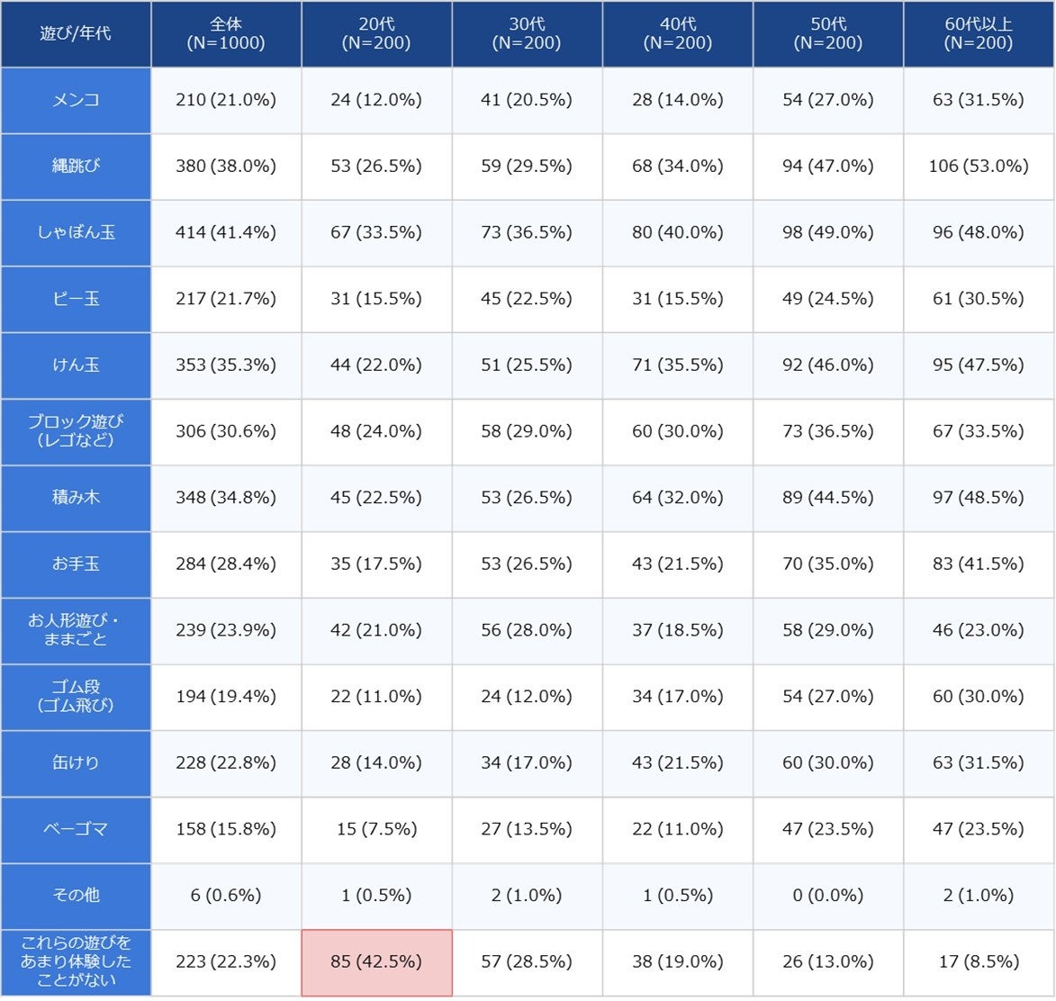 「しゃぼん玉」(40%)、「けん玉」(35.5%)、「縄跳び」(34%)などが人気です。「あまり体験したことがない」割合は19%と、若い世代よりは低くなります。