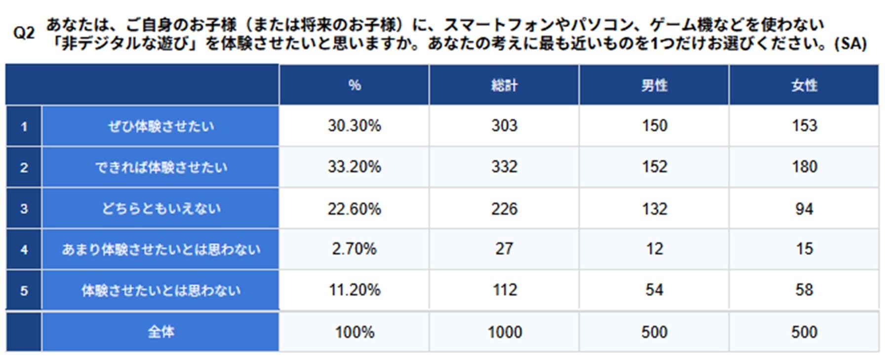 これらの積極的な層では、Q1 で「これらの遊びをあまり体験したことがない」と回答した割合が極めて低いです(「ぜひ体験させたい」層で3.3%、「できれば体験させたい」層で7.5%)。このことから、自身が非デジタルな遊びを体験し、その価値や楽しさを知っている人が、積極的に子どもにも体験させたいと考える傾向が強いことが読み取れます。