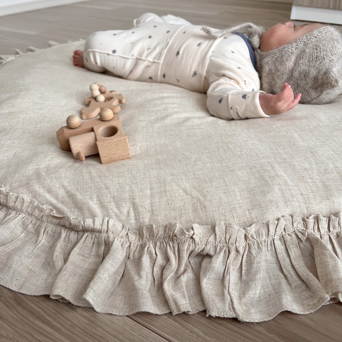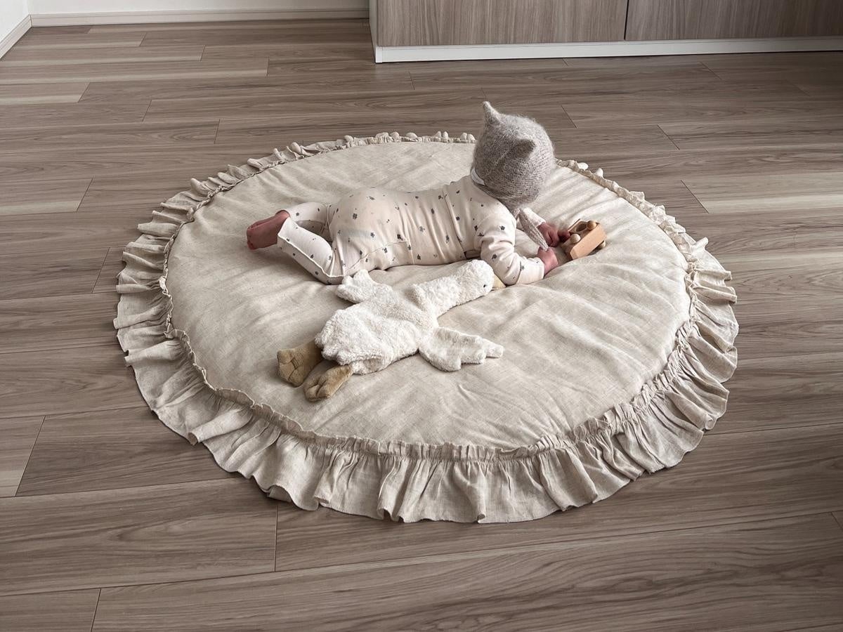 ティングルマットは、ホワイトやベージュなど淡いカラーのインテリアが好きなママに向けたラウンド型のプレイマット。