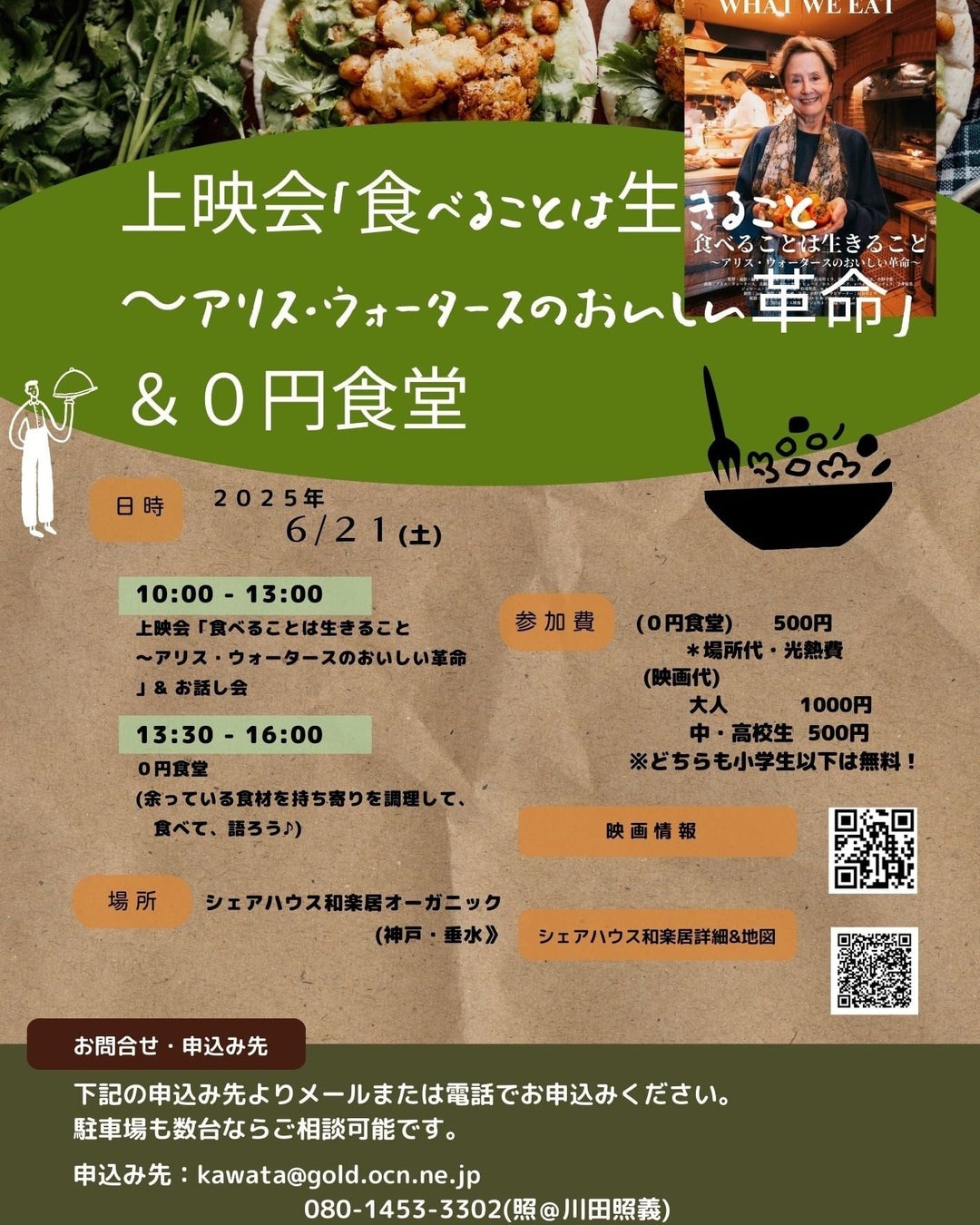 和楽居では、食を通じた持続可能な暮らしの実践をより広く共有するため、6月21日(土)に映画上映会と「0円食堂」イベントを開催します。上映される映画「食べることは生きること~アリス・ウォータースのおいしい革命~」は、「食べ方を変えれば、人の価値観、そして社会が変わる」と説くアリス・ウォータースの理念を追ったドキュメンタリーです。 映画上映後には、持ち寄り食材や賞味期限の近い食材を活用し、食品ロスを減らす「0円食堂」を実施。食品廃棄問題に取り組みながら、参加者同士の交流を深める場を目指します。