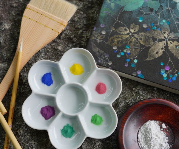 日本画家である立木美江の描く美しい図案をもとに、岩絵具、膠、絵筆といった本物の日本画材を使って絵を描き上げていくワークショップです。出来上がった絵は当日お持ち帰りいただけます。