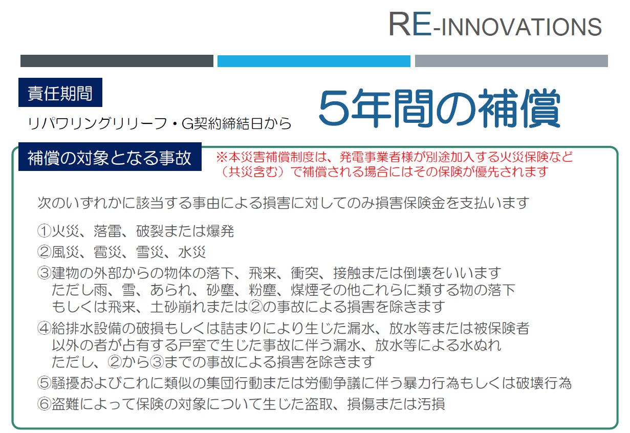 こうした背景を踏まえ、当社は「免責ゼロ&5年間の盗難・自然災害保険」が自動付帯する手厚い補償プランをご用意しました。当社が提供するO&Mコンシェルジュサービス『リパワリング Relief・G』をご契約または10kW以上1,000kW以下の太陽光発電システムを購入された事業者の皆さまを対象に自然災害等による偶発的な事故や盗難で損害が生じた修理費を補償します。