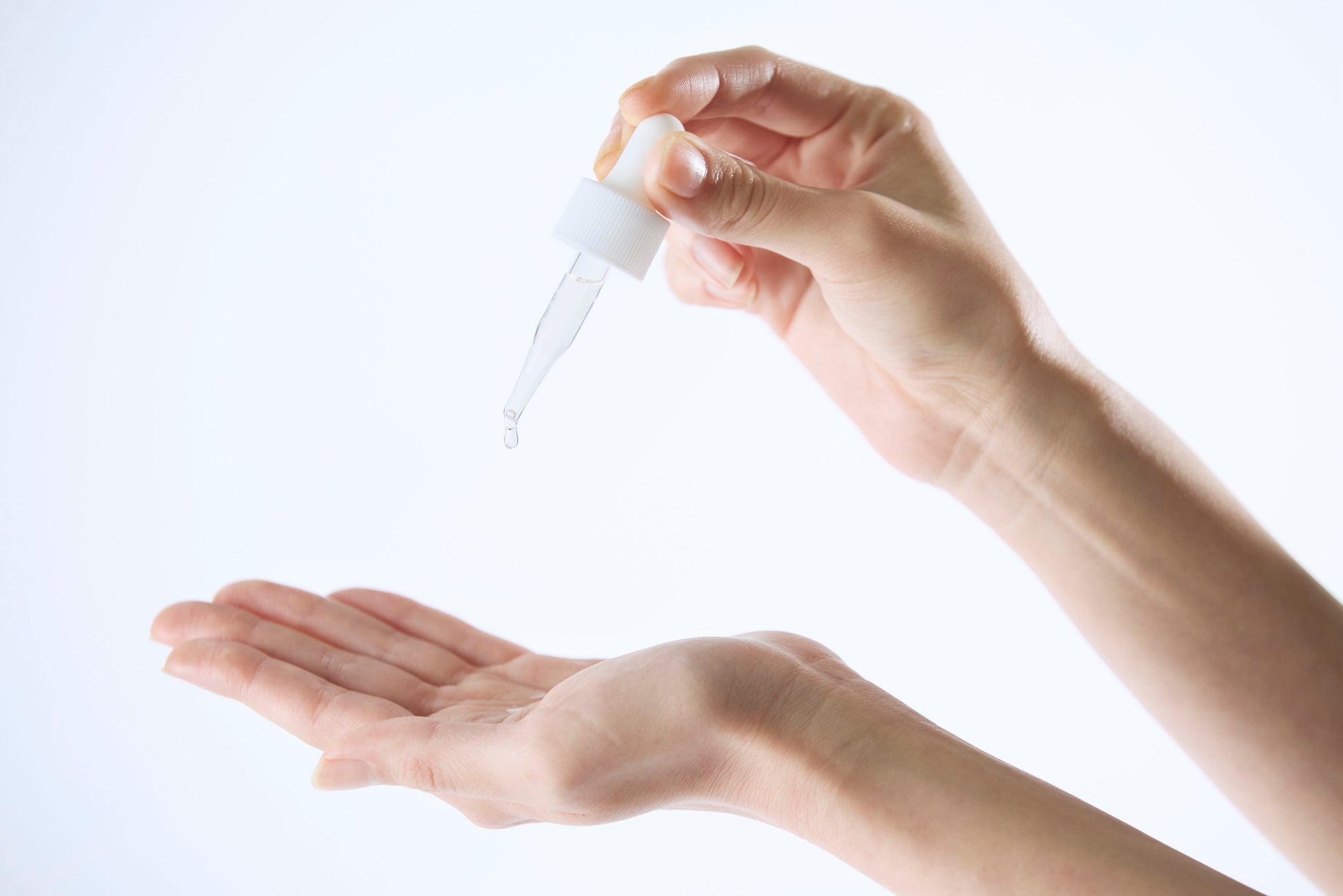 スポイトの半分程度(直径約2cm)を手のひらに取り、赤み・シミ・シワなど、気になる部分から優しく塗布してください。