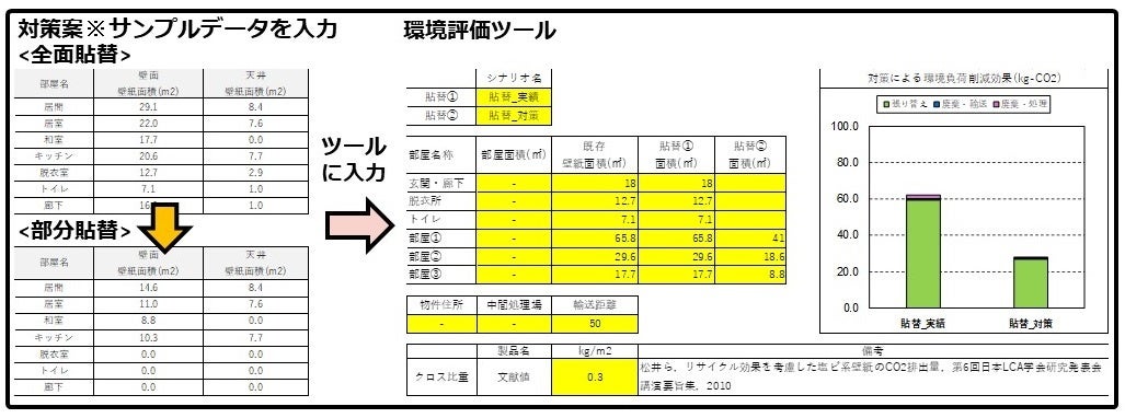 4.クロスの張替えについて、 全面張替え、 部分張替えのシナリオを整理し、 クロス張替えの環境評価ツール(試作版)により、環境負荷の低減効果を検証