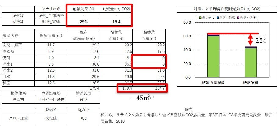 本評価ツールを用いて、2024年12月~2025年1月の期間において実際のクロス張替えの工事現場の調査 (図2) を行い、全面張替えから部分張替えにすることでクロスの更新に係るCO2排出量が18.4kg-CO2削減でき、25%削減されるとの評価結果が得られました。さらに、この検証結果より1m2クロスの張替を抑えることで0.412kg-CO2/m2が判明いたしました。