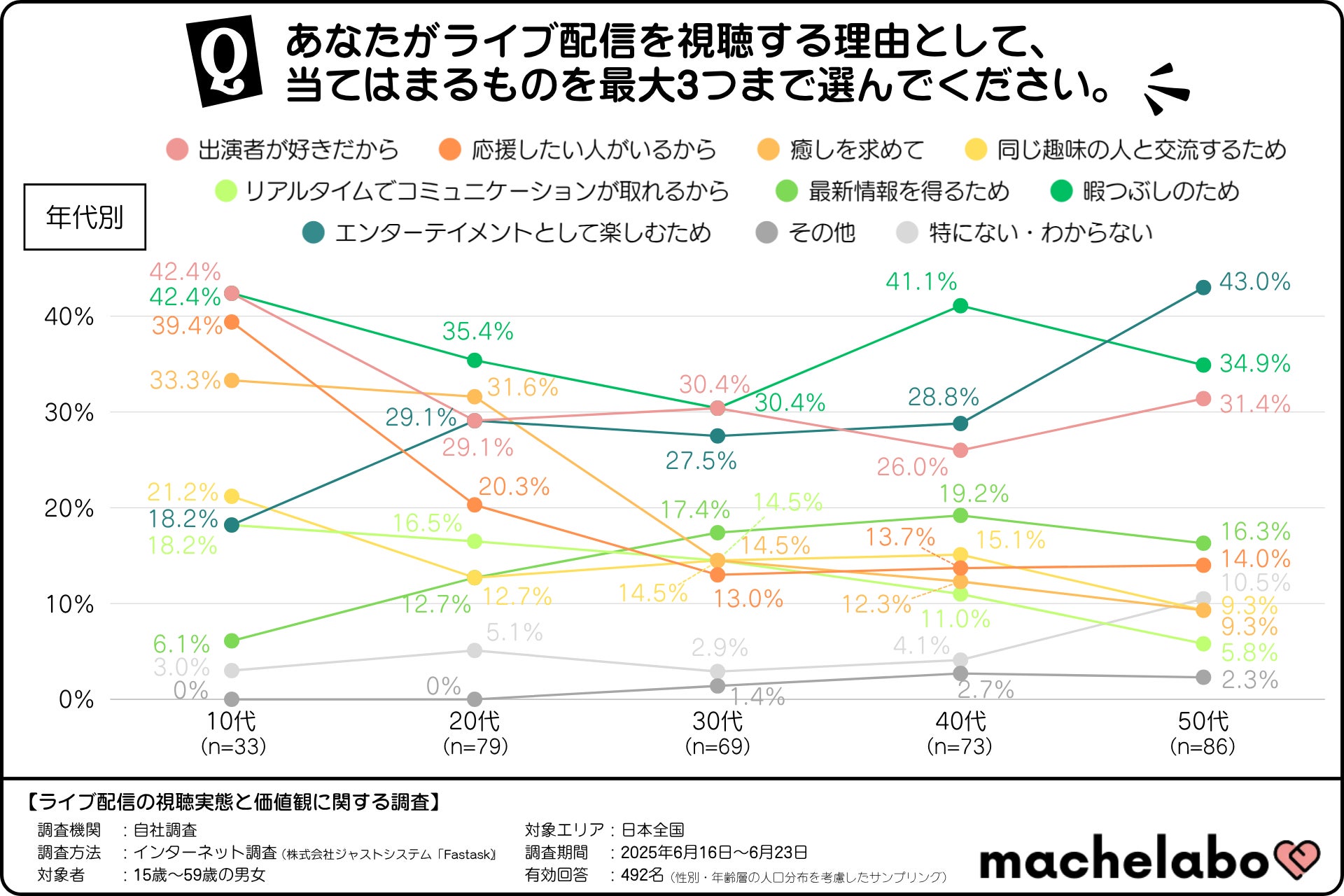 「暇つぶしのため」は各年代で共通して高く、10代が42.4%、次いで40代が41.1%、20代が35.4%となっています。一方、「エンターテイメントとして楽しむため」は50代が43.0%と突出して高い数値を示しており、中高年層にとってライブ配信は気軽な娯楽として位置づけられていることがわかります。