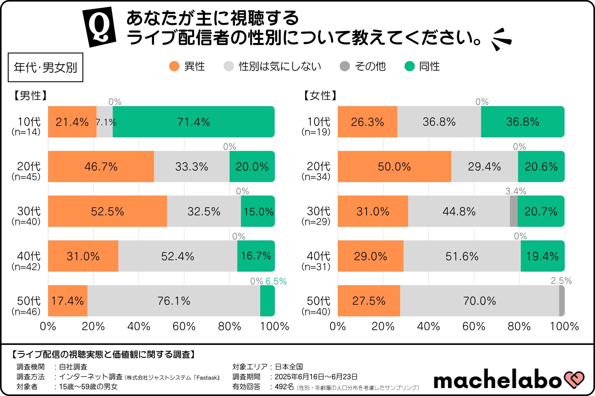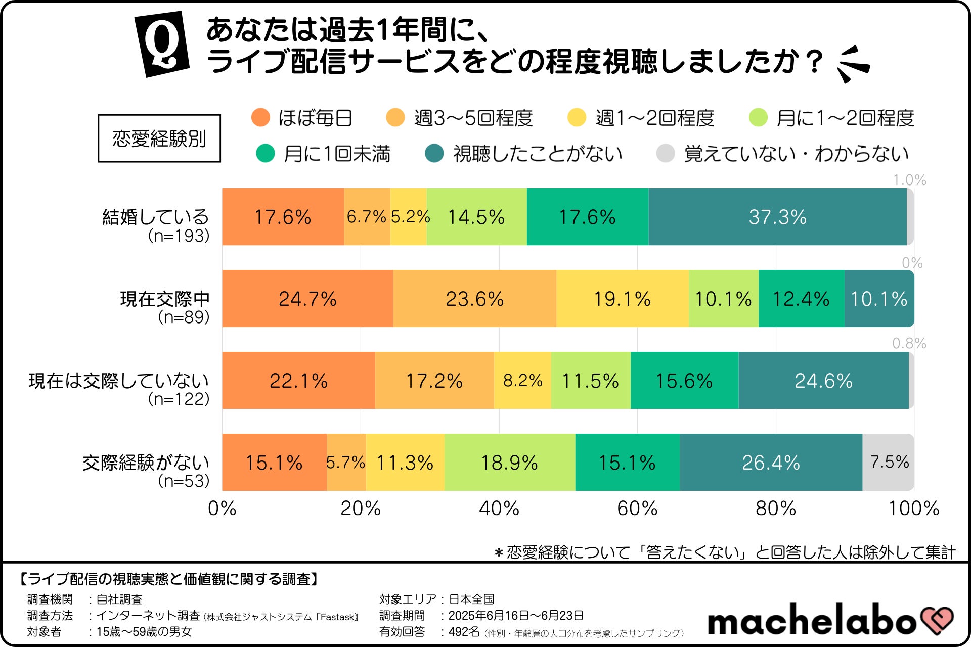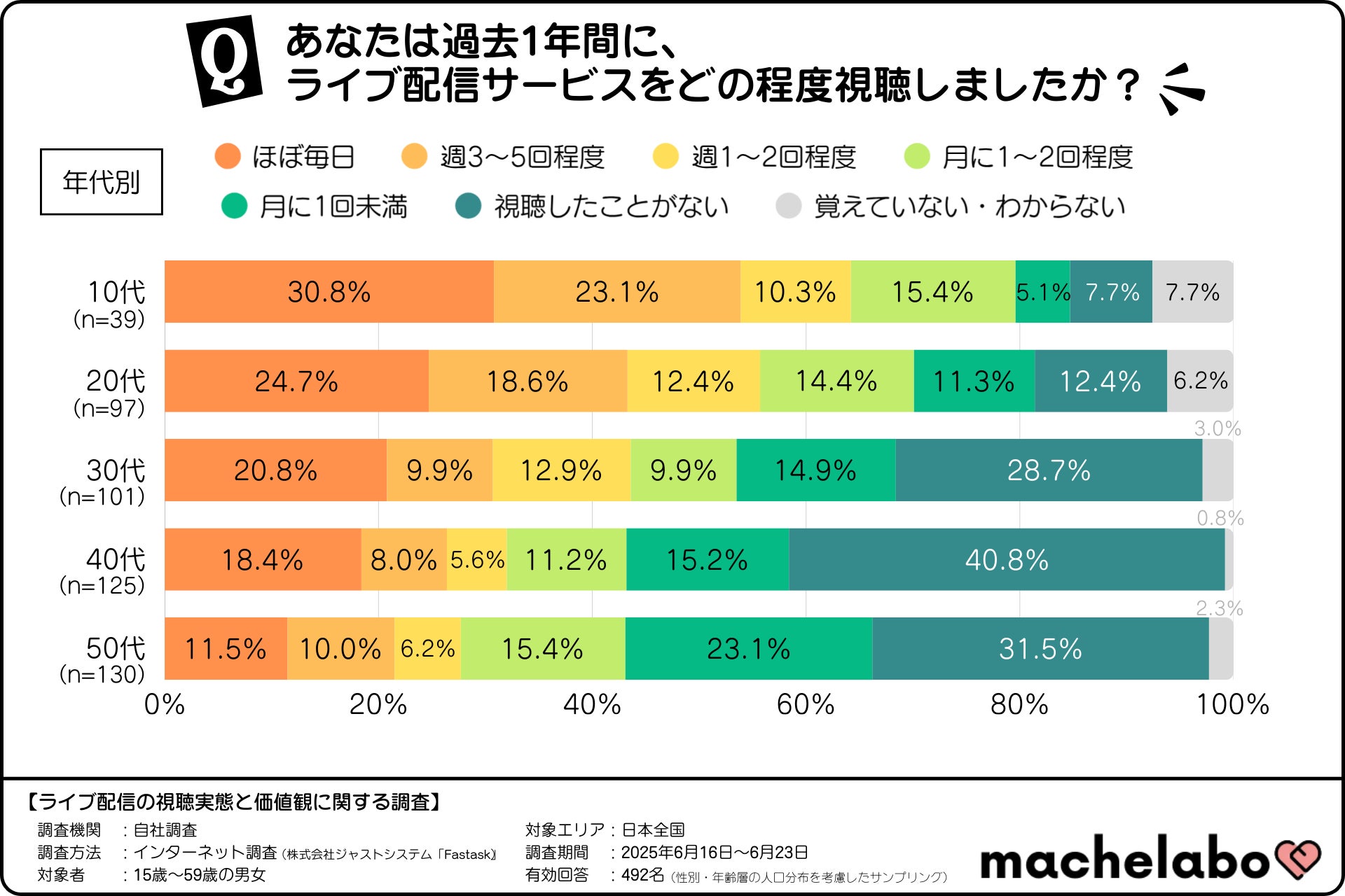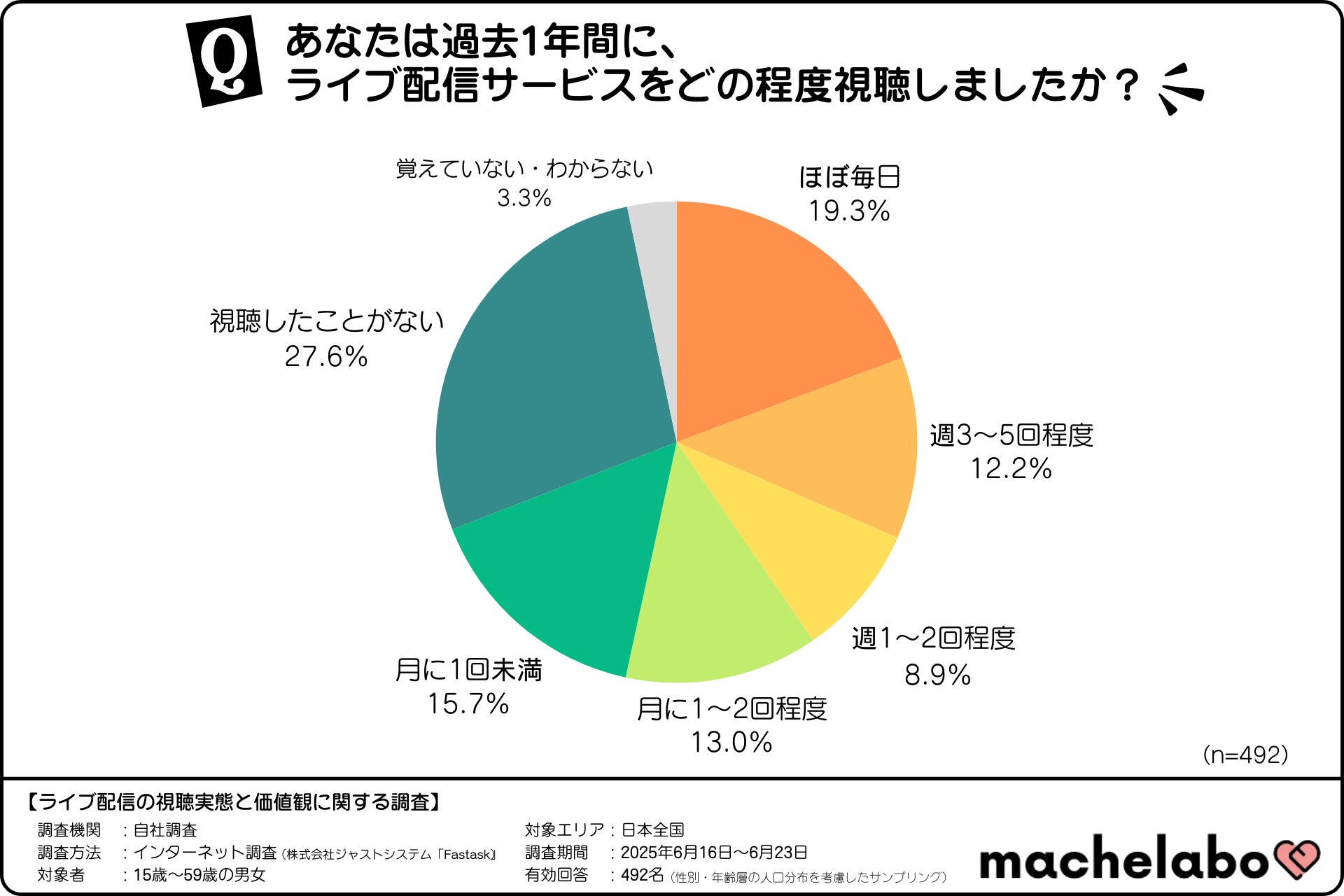 株式会社マシェバラトークが運営するオウンドメディア『マシェラボ』( https://machetalk.jp/media/ )編集部は、日本全国の15歳~59歳の男女492名を対象に、ライブ配信の視聴実態と価値観に関する調査を実施しました。