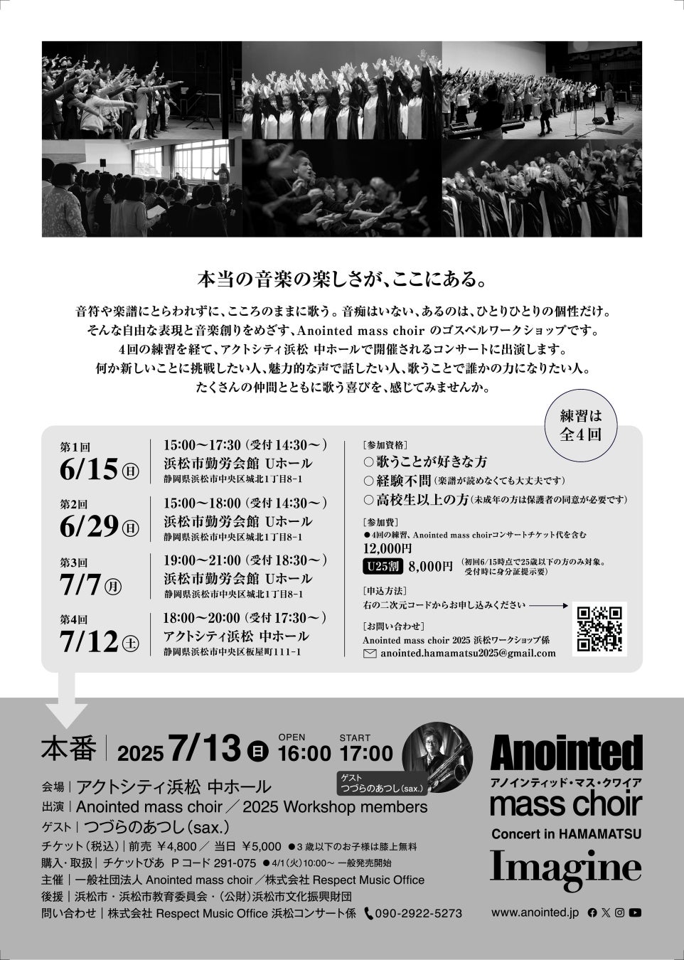 全国で活動するゴスペルグループ「Anointed mass choir(アノインティッド・マス・クワイア)」は、2025年7月13日(日)、アクトシティ浜松 中ホールにて、ゲストにサックス奏者 つづらのあつしを迎え、音楽を通して“平和”を願うことをテーマにしたコンサート「Imagine」を開催します。