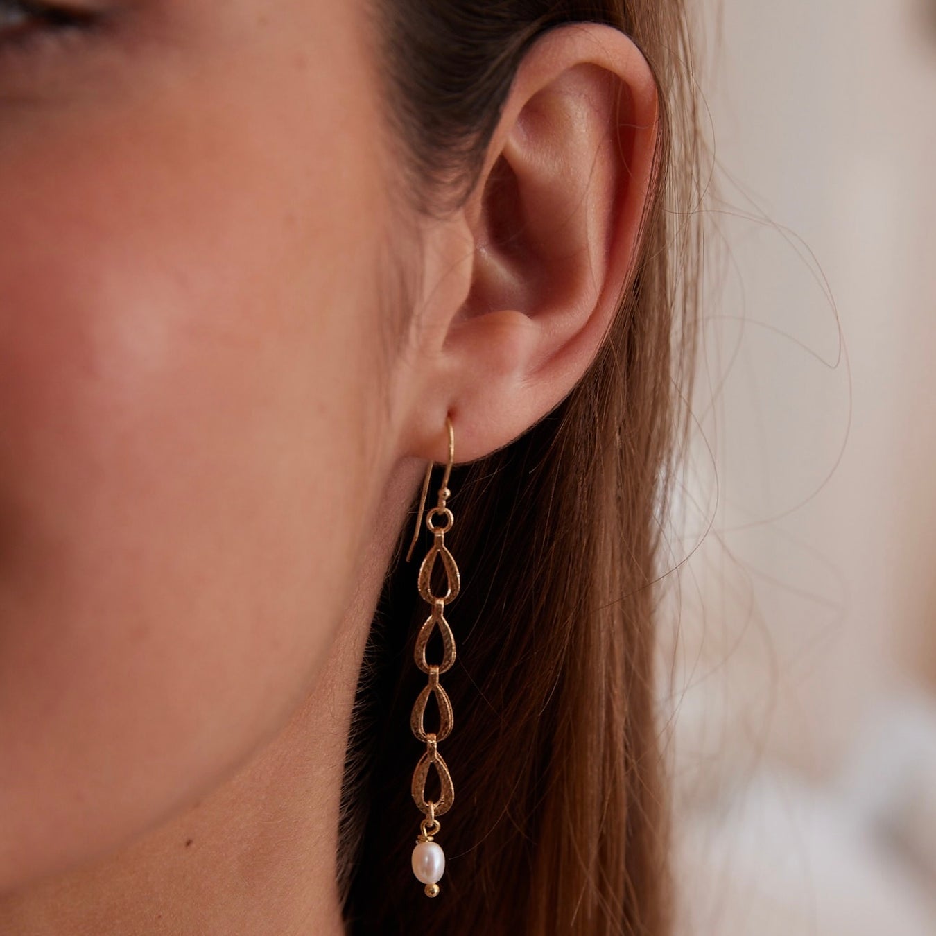 「LOU」ピアスは、縦に連なるドロップ型のゴールドピアスは、顔まわりを華やかに演出。シンプルながらも存在感があり、耳元に上品な輝きをプラスします。動くたびに揺れるデザインが、エレガントさをさらに引き立てます。
