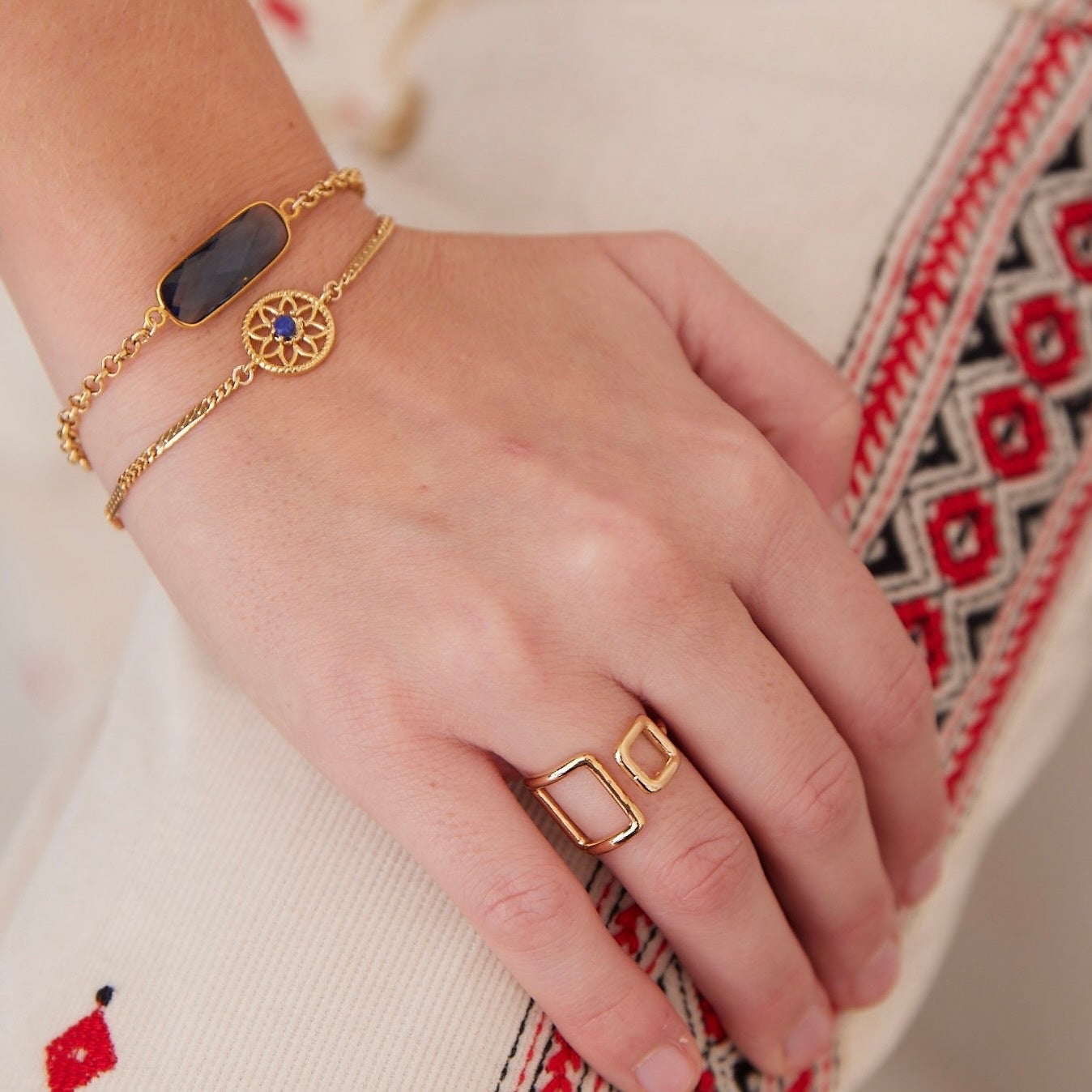 手元を華やかに彩る「MARINE」ブレスレットと「FRANCINE」ブレスレットは、夏のコーディネートに爽やかさと上品さをプラス。深みのあるブルーのストーンが目を引き、ゴールドのチェーンとのコントラストが際立ちます。日常使いはもちろん、リゾートや特別なシーンでも活躍するデザイン。シンプルでありながら存在感のあるリング
