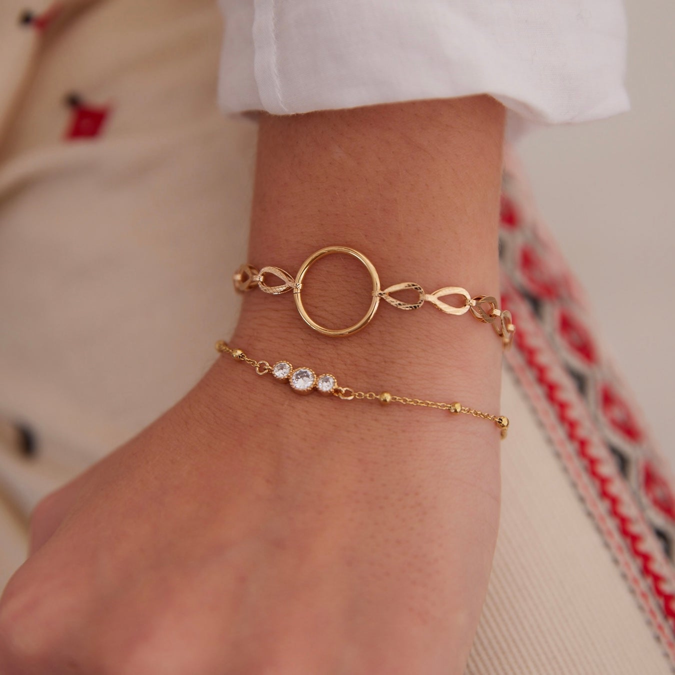 「LOU」ブレスレットは、サークルモチーフを中心に配置し、手元にさりげないアクセントを加えるデザイン。華奢なチェーンが手首を優美に彩り、他のブレスレットとの重ね付けもおすすめです。
