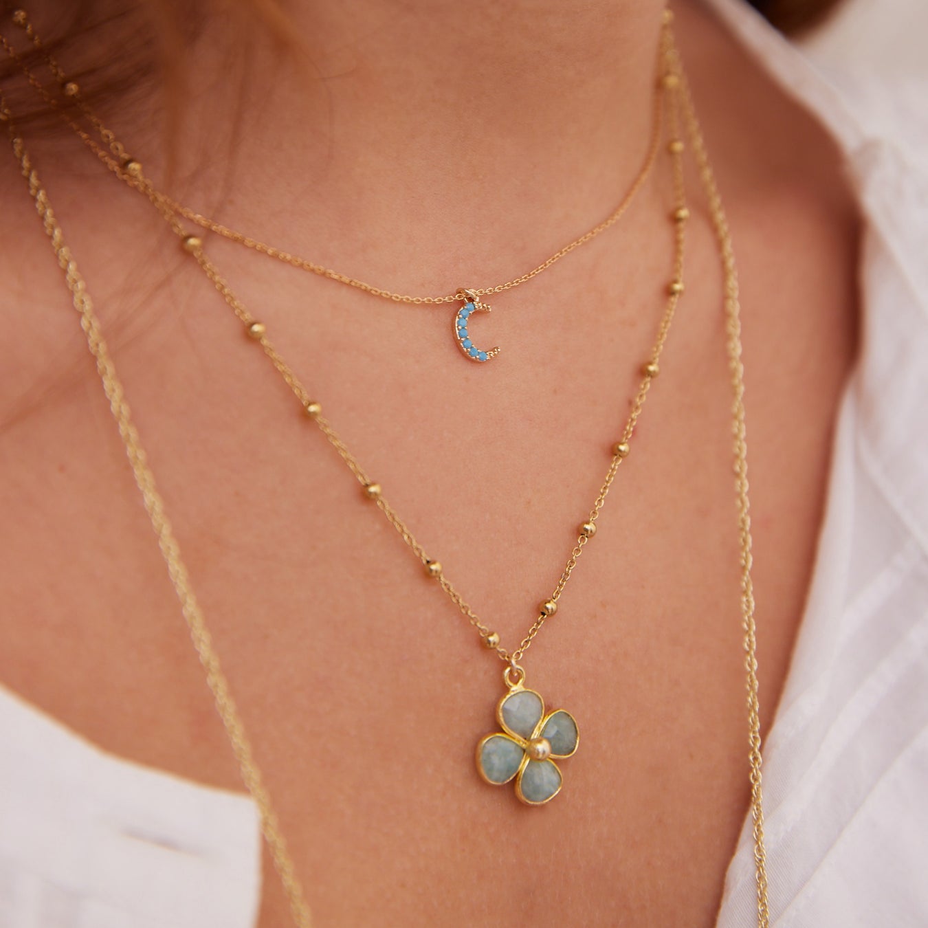 夜空に輝く三日月モチーフの「LUNE」ネックレスは、ブルーストーンのきらめきがミステリアスな魅力を演出。下に重ねた「MARGUERITE AMAZONITE」ネックレスは、アクアマリンのような淡いブルーの天然石が花びらを形作り、優しくフェミニンな雰囲気を添えます。ゴールドの繊細なチェーンとビーズが動くたびに揺れ、首元を華やかに彩るデザイン。ロマンティックな輝きをまとってみて。