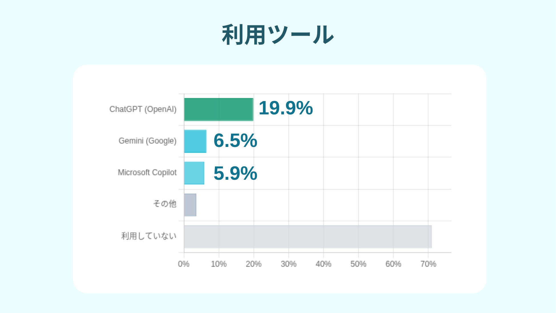 ・利用ツールは ChatGPT が 19.9 %Gemini 6.5 %、Copilot 5.9 %を大きく引き離す。