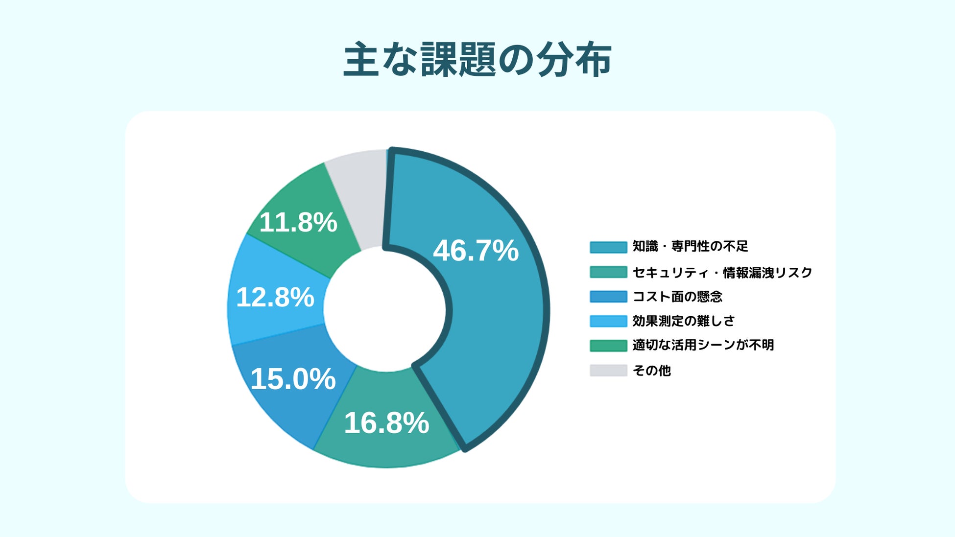 最大の阻害要因は「知識・専門性の不足」46.7%。社内にガイド役が不在で教育とハンズオン研修が急務となっている。次いで「セキュリティリスク」16.8%と「コスト面の懸念」15.0%が並び、IT統制とROI説明責任がボトルネック。「効果測定の難しさ」12.8%は成功指標未整備を示唆し、「活用シーンの不明確さ」11.8%は具体事例の不足が要因として考えられる。