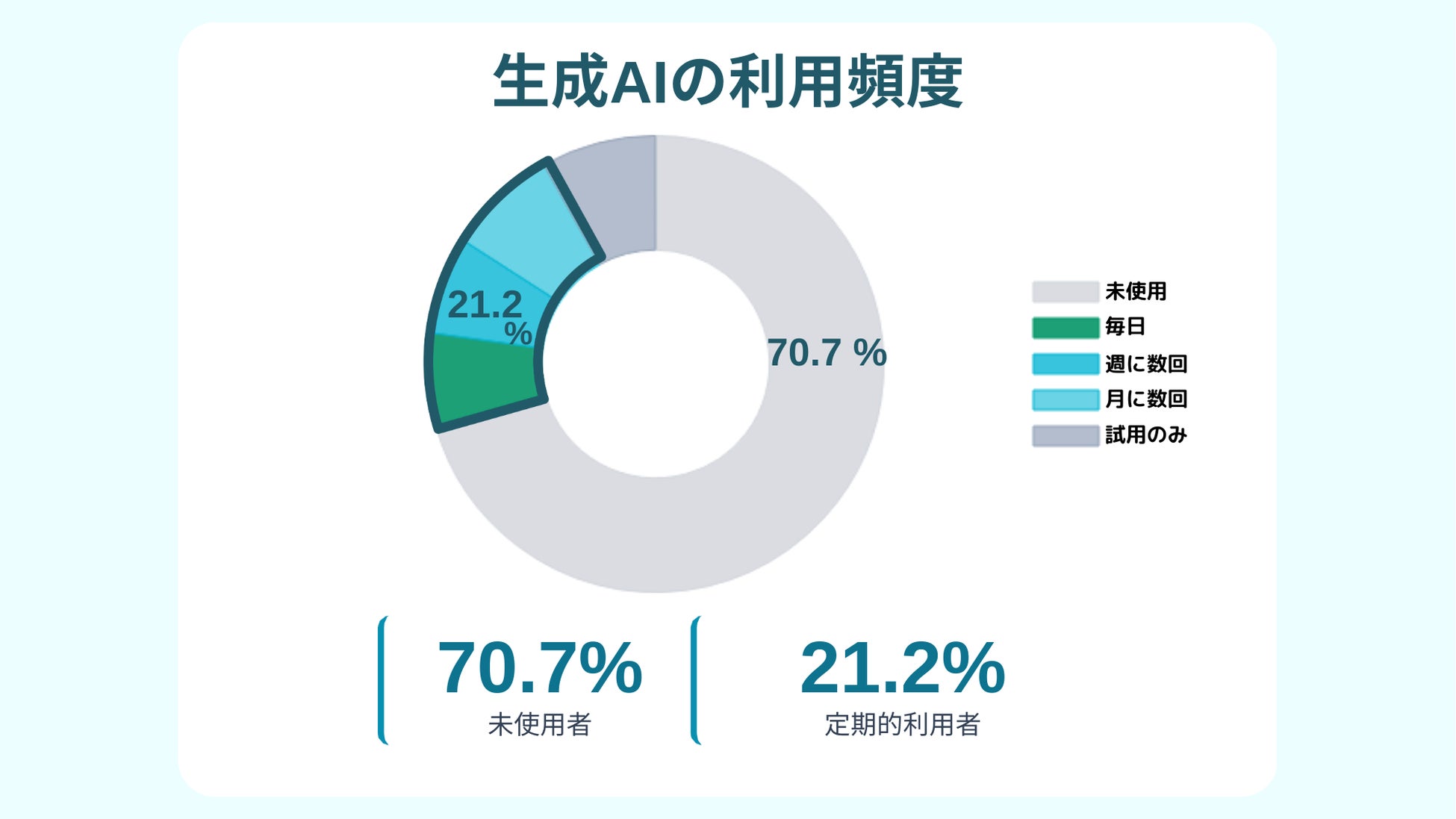 回答企業の70.7%が生成AIを「まったく使っていない」と回答し、導入は依然限定的。一方、週数回以上の定期利用者が21.2%存在し、早期導入組が一定割合で定着。試用のみの“様子見”層は8.1%で、関心はあるが踏み切れない企業も多い。