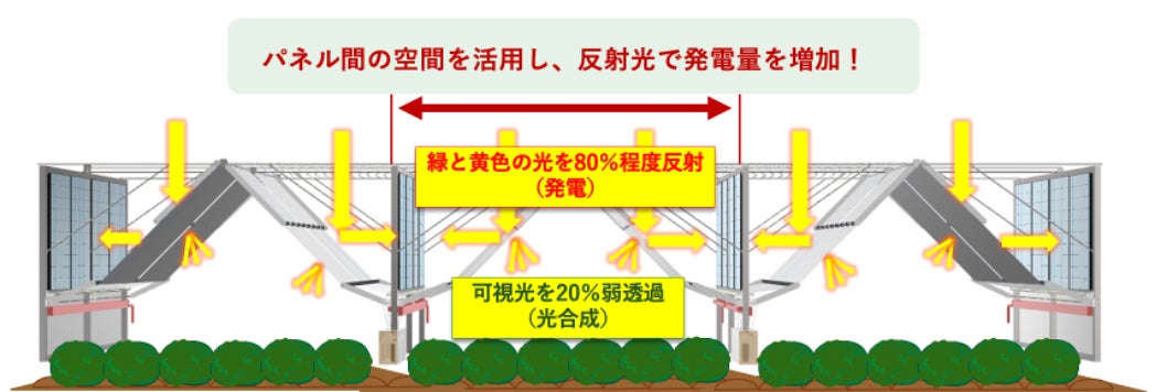 本技術は、両面発電が可能な垂直設置型の太陽光パネルに、独自開発の半反射フィルムを組み合わせたもので、農地の日射量を最適にコントロールしつつ、高効率な発電を可能にする、世界初の画期的なソーラーシェアリングシステムです。