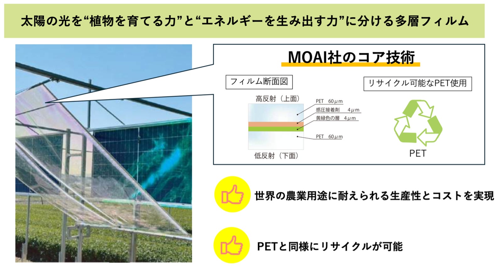 こうした状況を受け、株式会社MOAIは、再生可能エネルギーと農業の共存を可能にする「半反射フィルム式・垂直型ソーラーファーム」技術を開発。