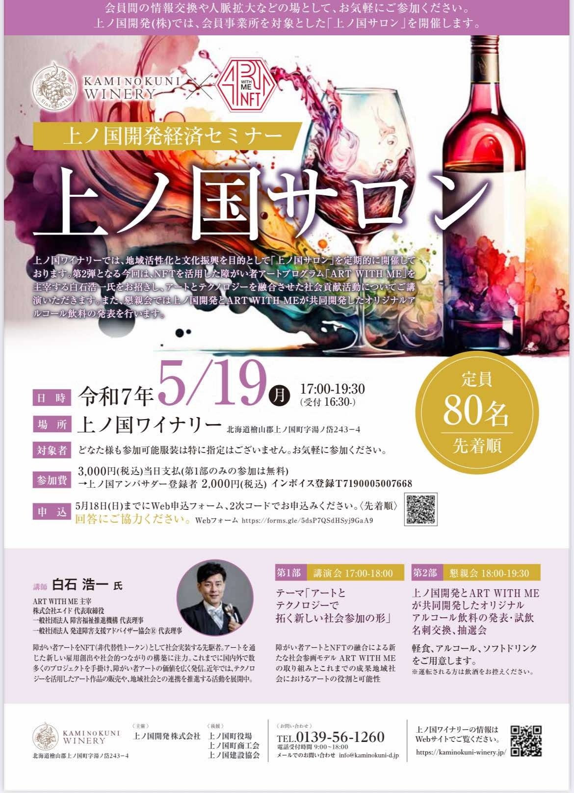 また発売に先がけ、5/19(月)に上ノ国ワイナリーにて「ART WITH ME」を主宰する白石浩一が、上ノ国開発経済セミナー【上ノ国サロン】を開催いたします。