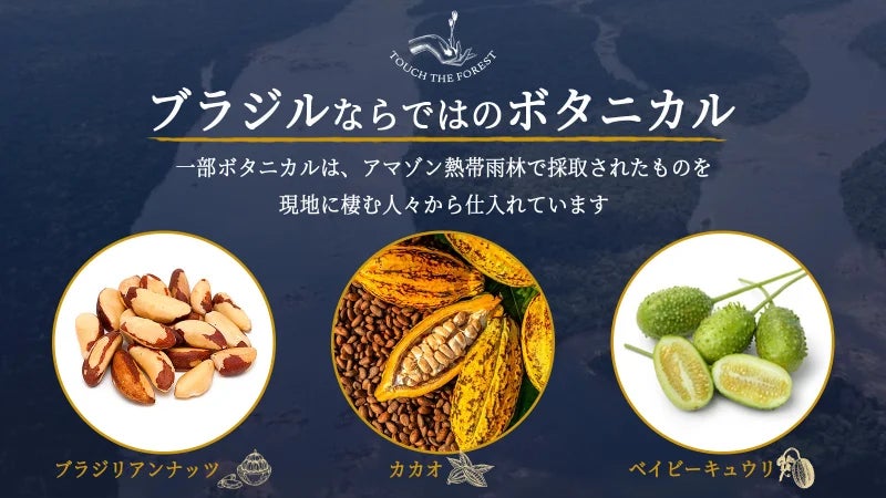 ブラジリアンナッツ、カカオ等のブラジルならではのボタニカル使用。ボトル1本につき約126円がアマゾン熱帯雨林の保護、そこに住む人々の楽しみをサポートするために寄付。飲めばアマゾンと笑顔でつながります!