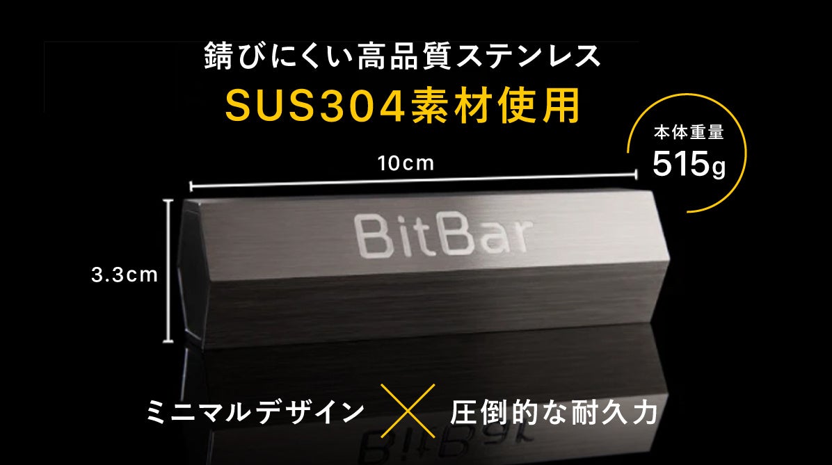 「BitBar (ビットバー)」は、重厚感のある純金属「SUS304ステンレス鋼」を使用しています。耐熱・防水・耐腐食性に優れ、火災や水害などの災害時にもシードフレーズを安全に守る、長期保管に最適な設計です。