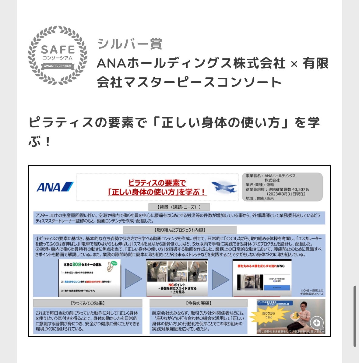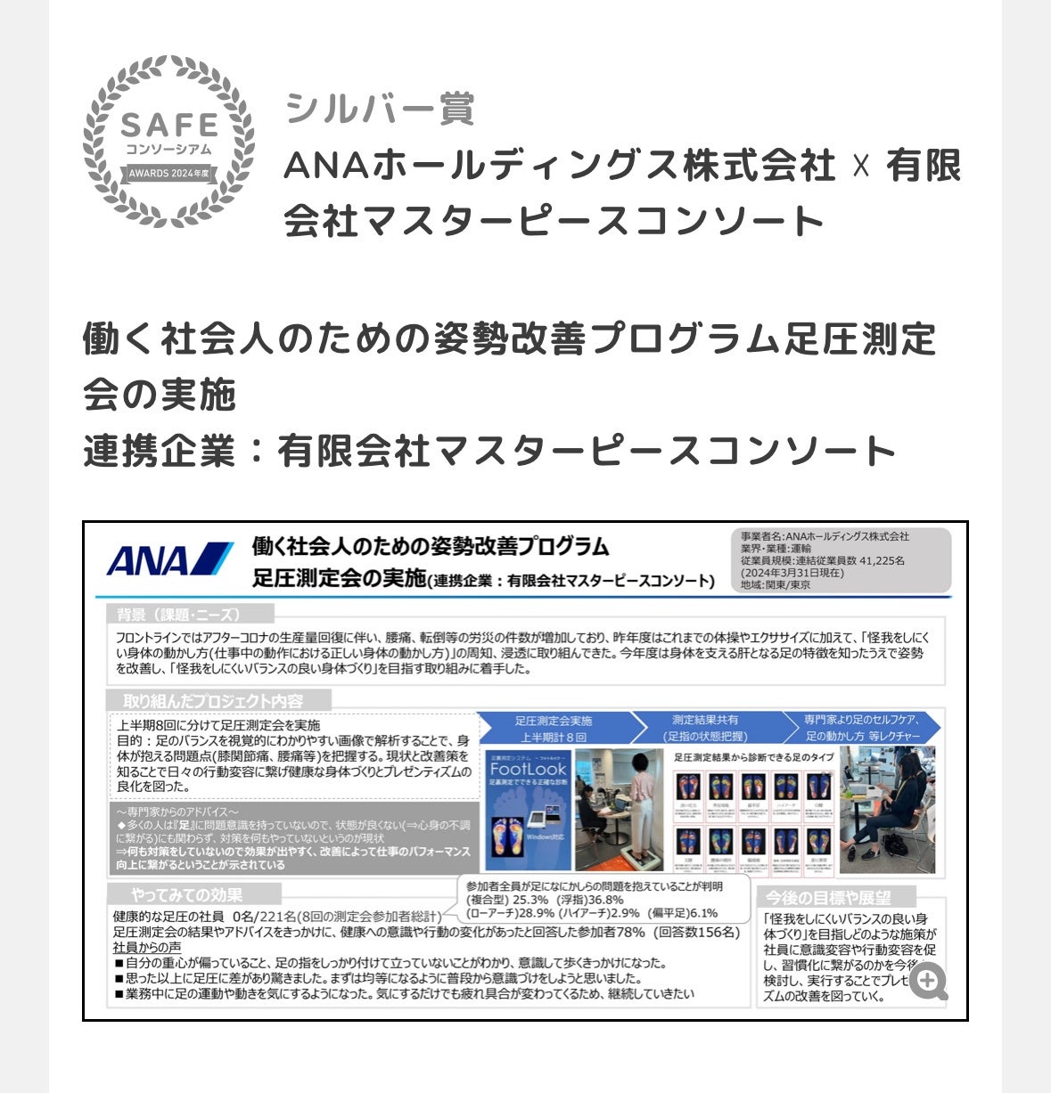当社関係会社、有限会社マスターピースコンソートとANAホールディングス(株)が連携開発した姿勢改善プログラム「足圧測定会」が、厚生労働省所管「SAFEコンソーシアム」にてシルバー賞を受賞いたしました。この受賞は、本プログラムが働く方々の健康増進へ大きく貢献した点が高く評価されたことによるものです。なお、同コンソーシアムのシルバー賞は、2023年に実施したANAホールディングス(株)とのピラティス関連プログラムに続き、2度目の受賞となります。
