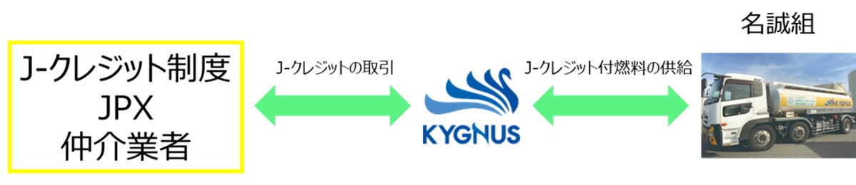 今回の実証では、キグナスから株式会社名誠組(本社:愛知県飛島村、代表取締役社長:安井誠|以下、名誠組)へカーボンオフセット燃料を供給します。その結果、名誠組は、キグナス向けの配送に使用するローリーから発生する軽油の燃焼に伴うCO2排出量を100%オフセット致します。実証終了後、オフセットの総量等は、改めて報告の予定です。