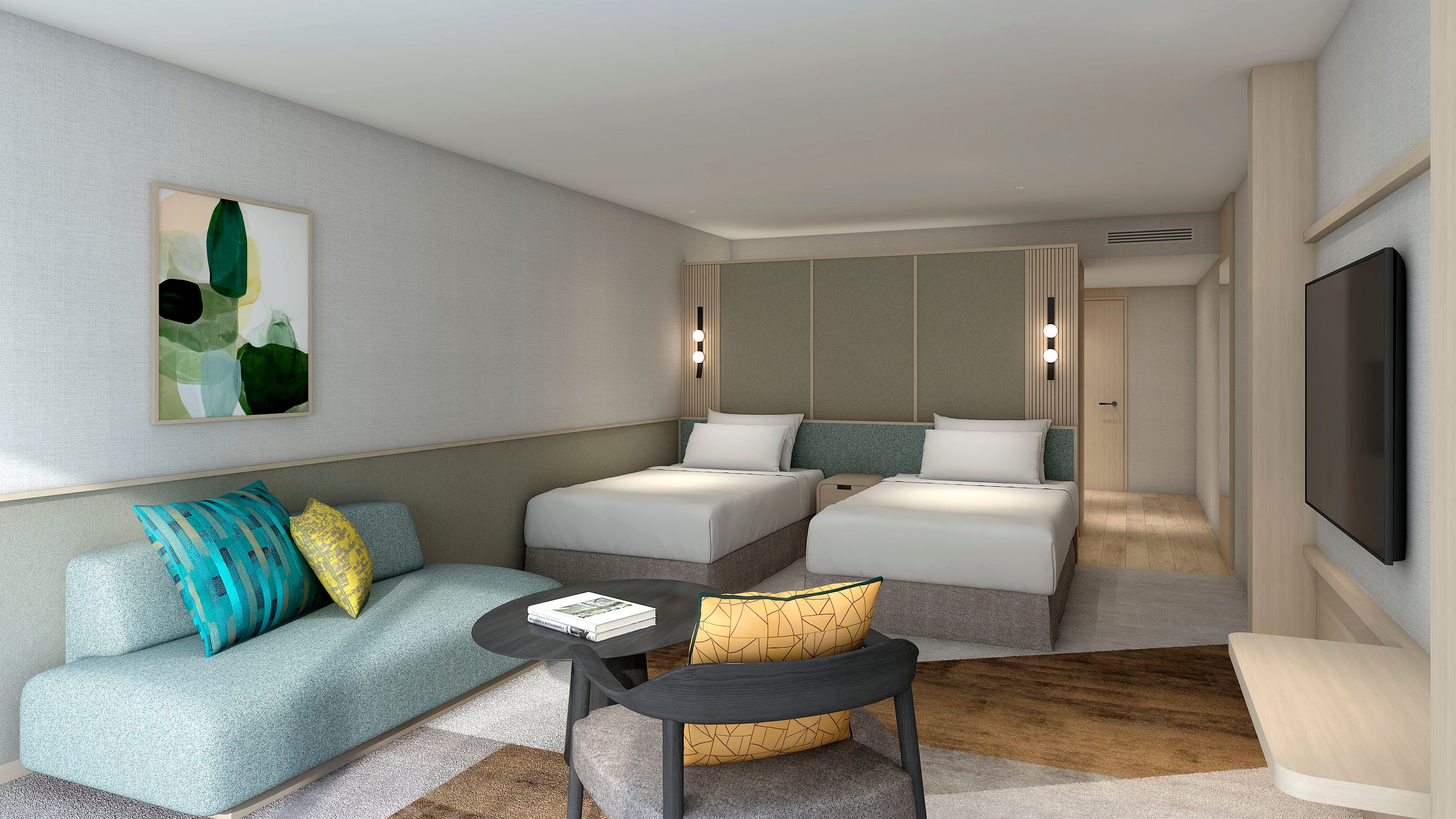 ゲストルームは合計102室。スタンダード(29㎡)、プレミアム(40㎡)、キッズスイート(56~60㎡)、ファミリースイート(56~90㎡)の4タイプ(ホテル棟100室)に加え、愛犬と一緒にご滞在いただけるドッグフレンドリー・コテージ(80㎡、2棟)をご用意しました。アクティビティや観光をフルに満喫したい女子旅や、親しい友人と過ごすグループ旅行、家族の絆を深める3世代ファミリー旅行など、目的やシーンに合わせてゲストルームのタイプをお選びいただけます。