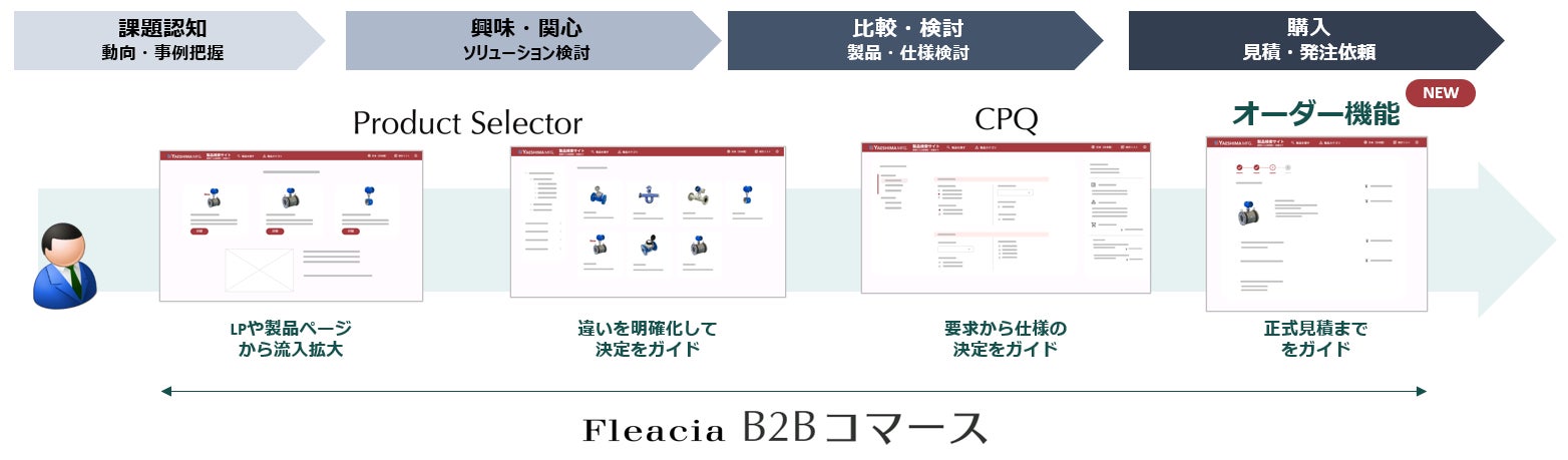 「Fleacia B2B コマース」は、「Fleacia Product Selector」および「Fleacia CPQ」の新オプションとして「オーダー機能」が追加された一連のソリューションです。