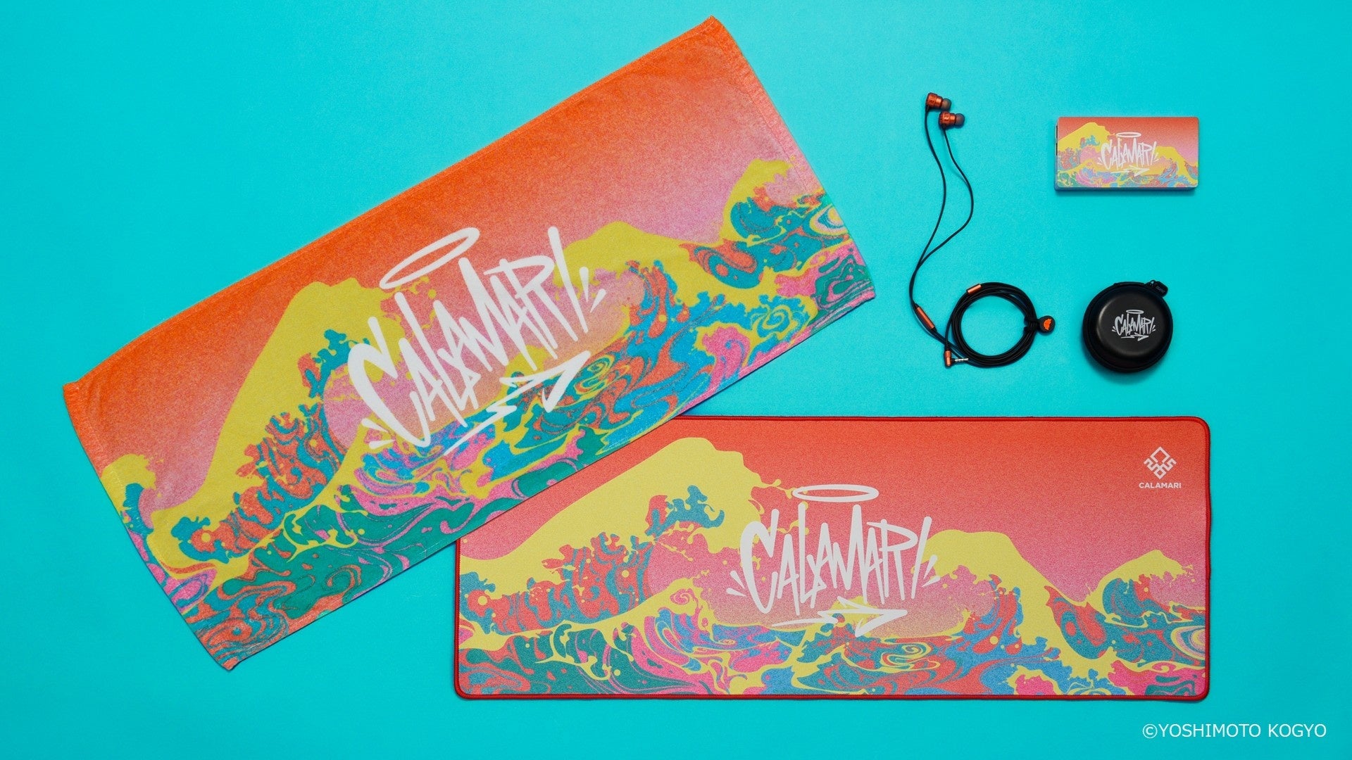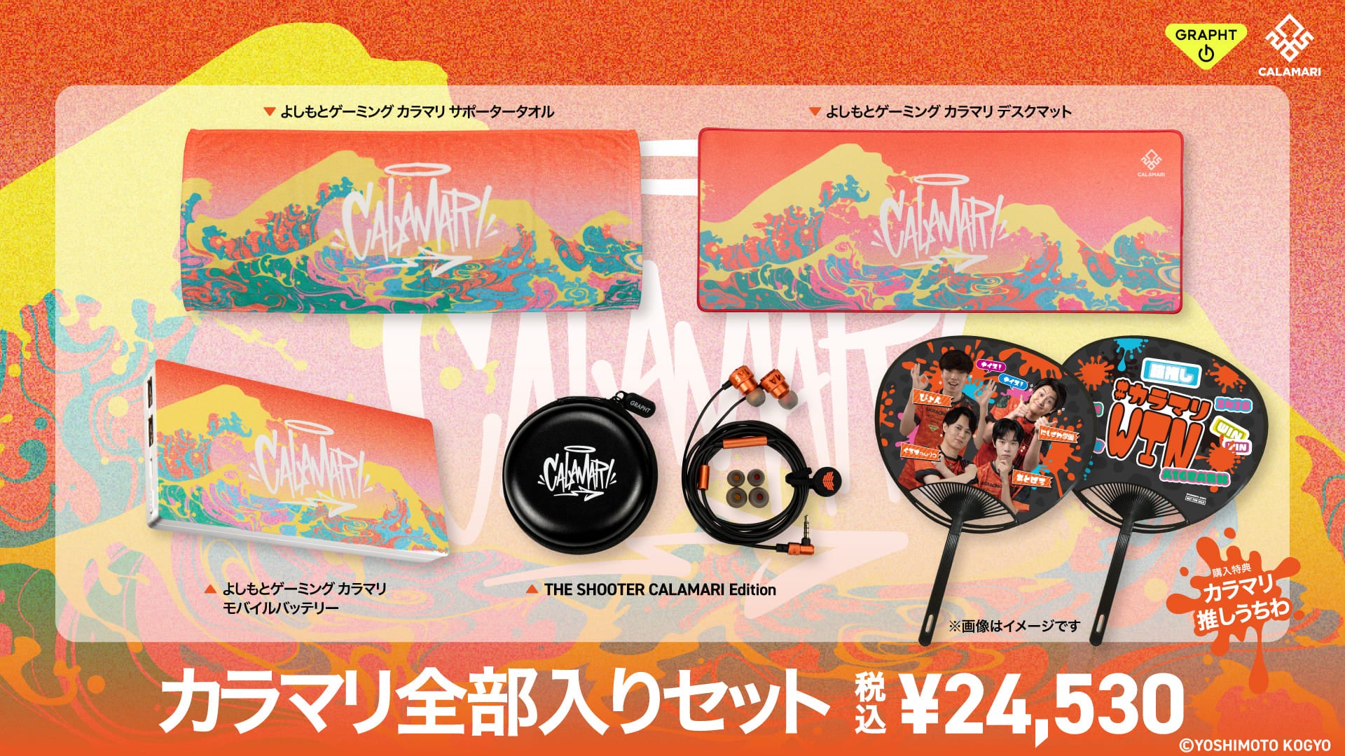 さらに、「カラマリ」の「よしもとゲーミング」加入5周年(※)を記念し、描き下ろしアートをデザインしたデスクマット、モバイルバッテリー、サポータータオルをECサイト限定で同時に展開いたします。デスクや外出先でも「カラマリ」を応援できるアイテムラインアップです。