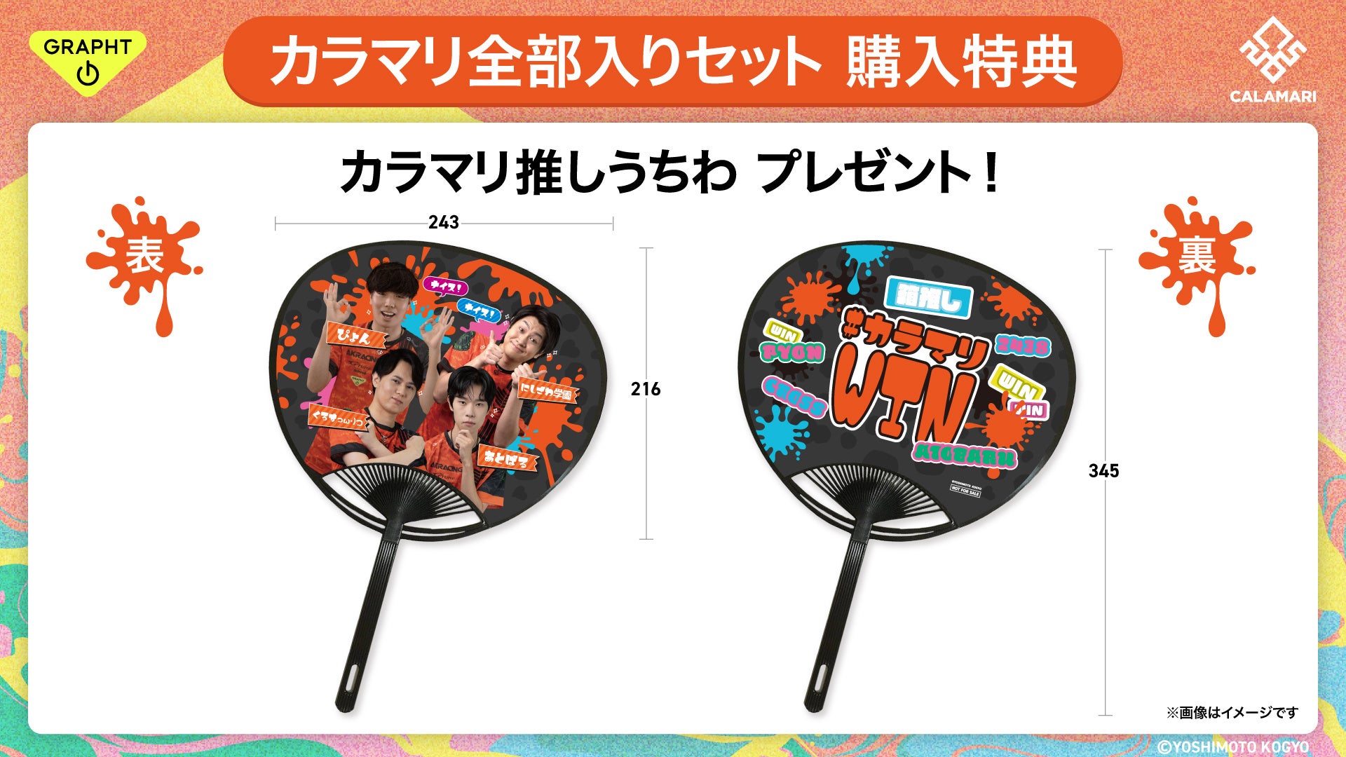 GRAPHT OFFICIAL STORE(ECサイト)限定の『カラマリ全部入りセット』をご購入いただいたお客様に、オリジナルデザインの「カラマリ推しうちわ」をプレゼントいたします。日常使いはもちろん、「カラマリ」メンバーのプレイを応援するシーンやオフラインイベントでぜひご活用ください。