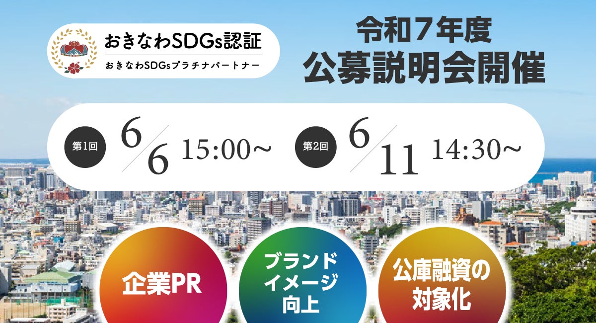 沖縄県は、「おきなわSDGs認証制度」の令和7年度公募開始にあたり、2025年6月6日及び6月11日にオンラインにて公募説明会を開催いたします。認証制度のメリットや申請書作成方法、審査基準など、認証取得のコツを解説するとともに、昨年度認証取得団体へのインタビュー動画を放映。認証取得団体の生の声を聞くことができます。オンラインで開催し参加費は無料、事前申込みが必要です。