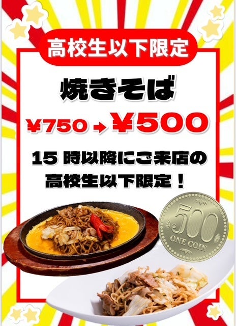 焼きそば500円と言う価格設定で、気軽にワンコインで食べて頂ける新サービスと