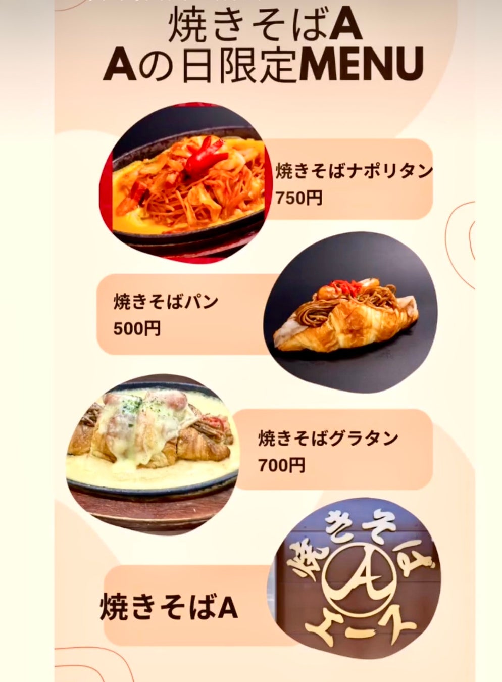 Aの日(1が付く日1,11,21,31日)しか食べられない限定メニュー焼きそばナポリタン、