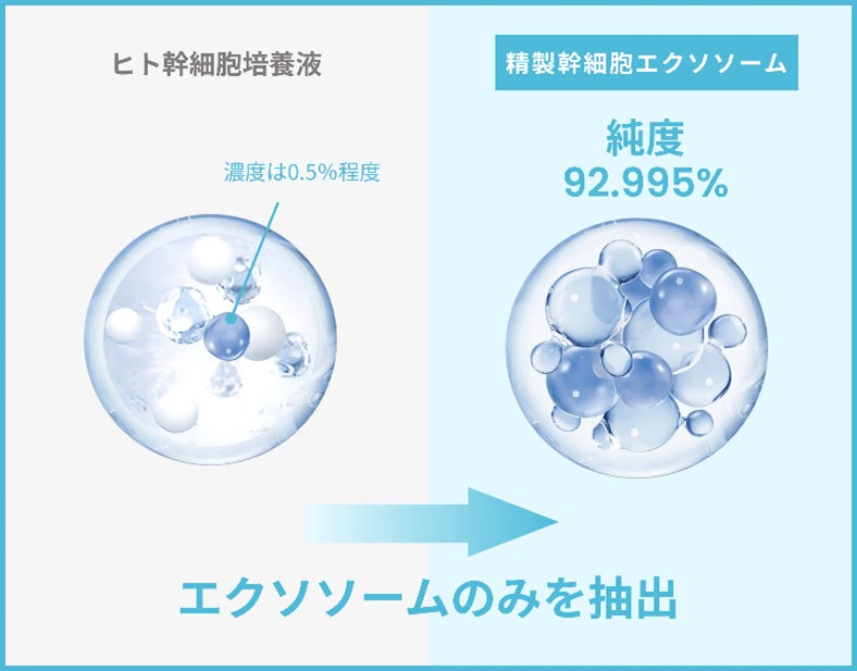 どんなに優れた美容成分を使用しても、肌がそれを適切に活用できなければ十分なケアは難しいとされています。そこで近年注目されているのが、エクソソーム。細胞間の情報伝達を担うナノサイズの物質です。当社が使用しているエクソソームは、純度92.995%の精製幹細胞エクソソームです。不純物を極限まで取り除き、健やかな肌作りをサポートします。
