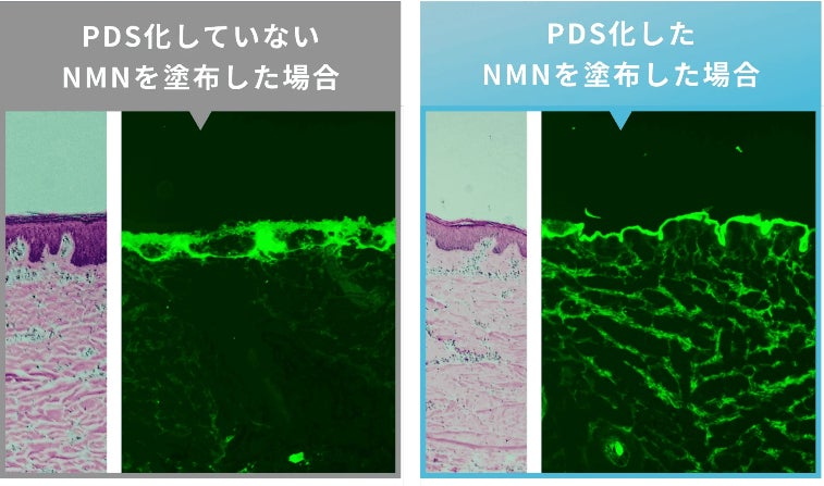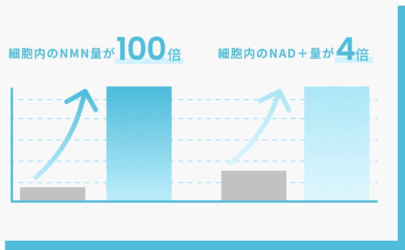 日本薬学会の研究によると、NMNを肌に塗布することで、細胞内のNMN量が100倍、NAD+量が4倍に増加したことが報告されています。