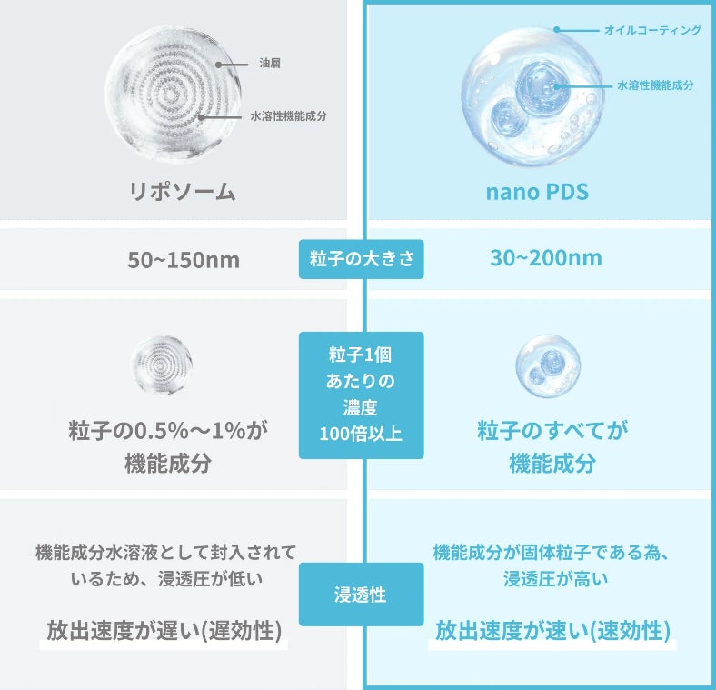 従来の「リポソーム技術」は、リン脂質で作られた多層カプセルによって成分を包み込み、「ゆっくりと浸透」させる仕組みです。一方、nanoPDS®は無水で、粒子そのものが機能成分となります。
