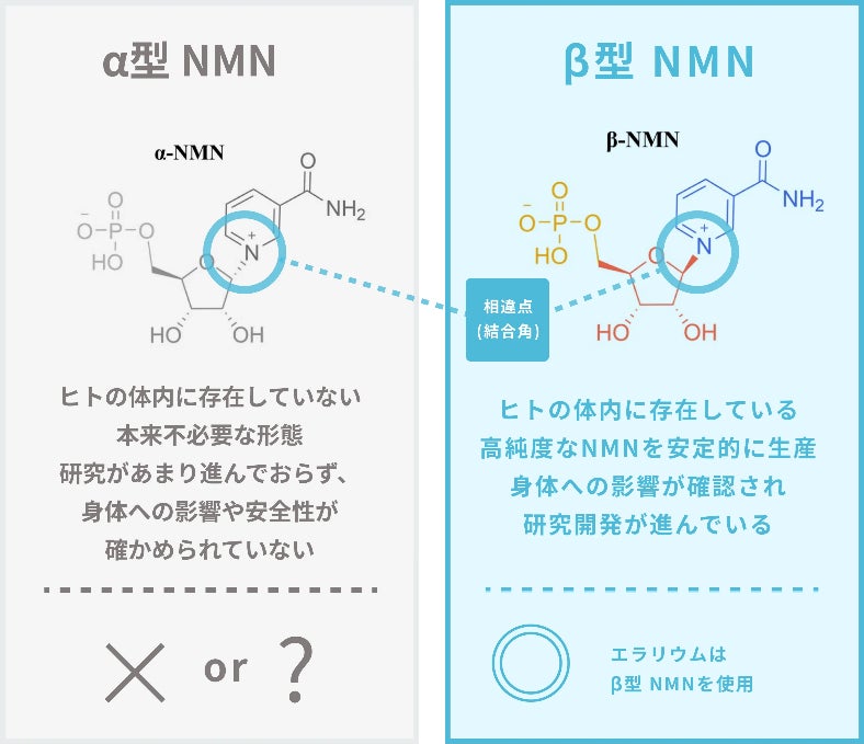 NMNにはα型とβ型の2種類があり、人体に存在するのは β-NMNです。β-NMNはエイジングケアに適した成分であるのに対し、α-NMNは研究が進んでおらず、安全性が確認されていません。そのため、ERALIUMでは β-NMNのみを使用しています。