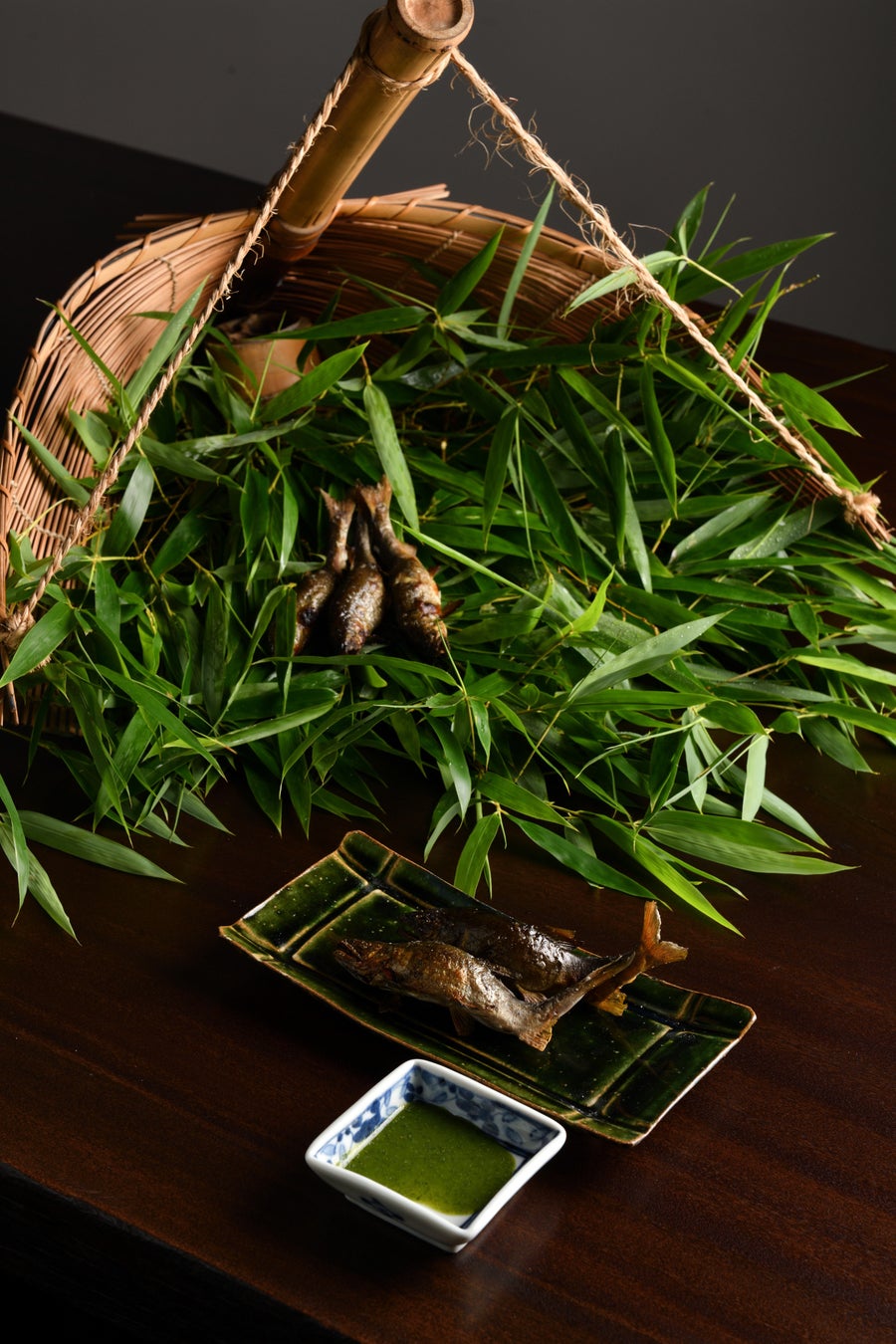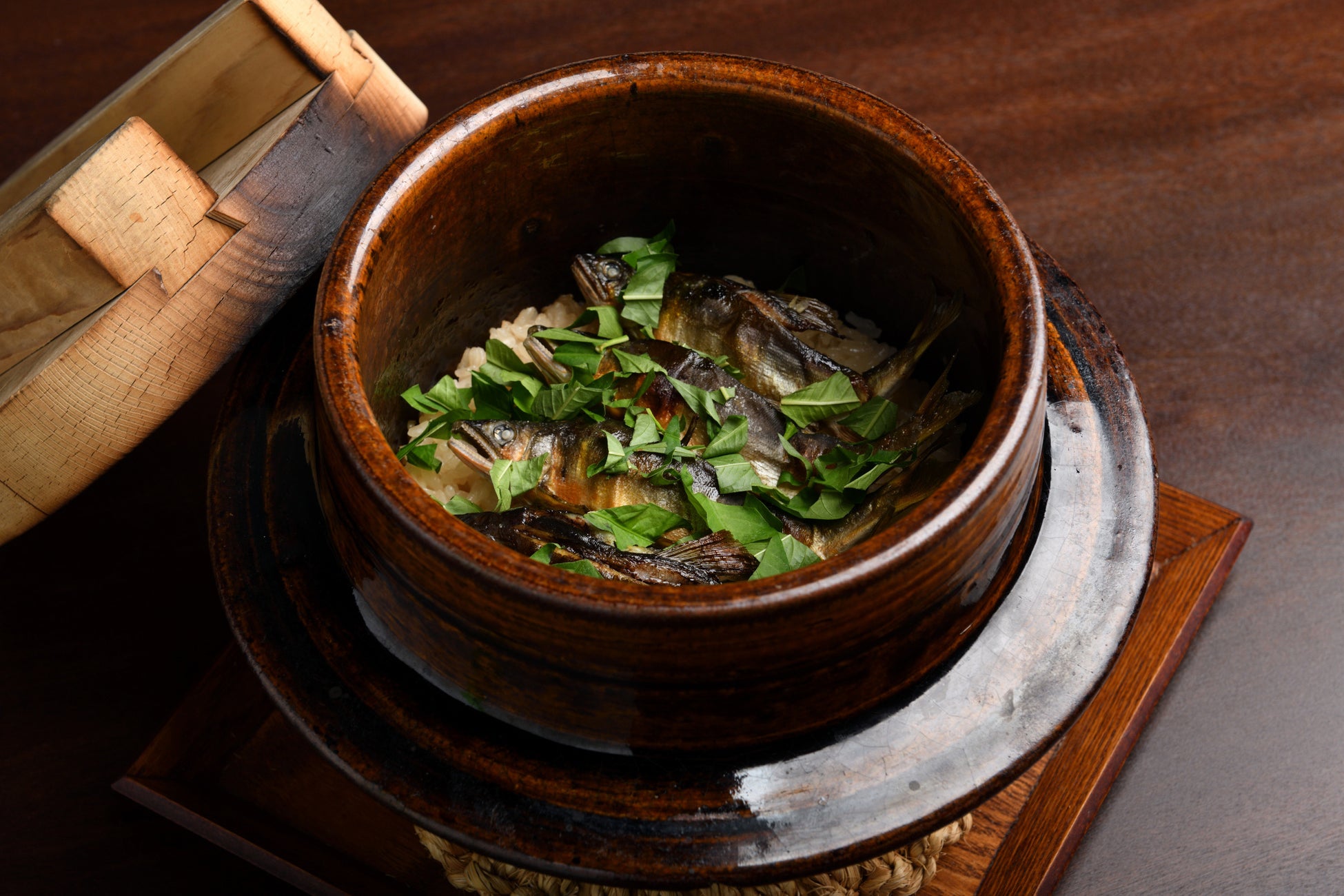 鮎は季節によって食感・香り・味わいが大きく変化する魚として知られています。鮎漁解禁後、初物で縁起がよいとされ小ぶりでも香り高い「はしり」。旬真っ盛りの「さかり(旬)」。そして夏の終わり頃子持ち鮎などが楽しめる「なごり」。それぞれの季節に合わせ、ご提供の内容は最適なものに変わります。一例として、「はしり」の季節である7月は鮎の炭火焼きと釜炊き鮎ご飯などをお楽しみいただけます。