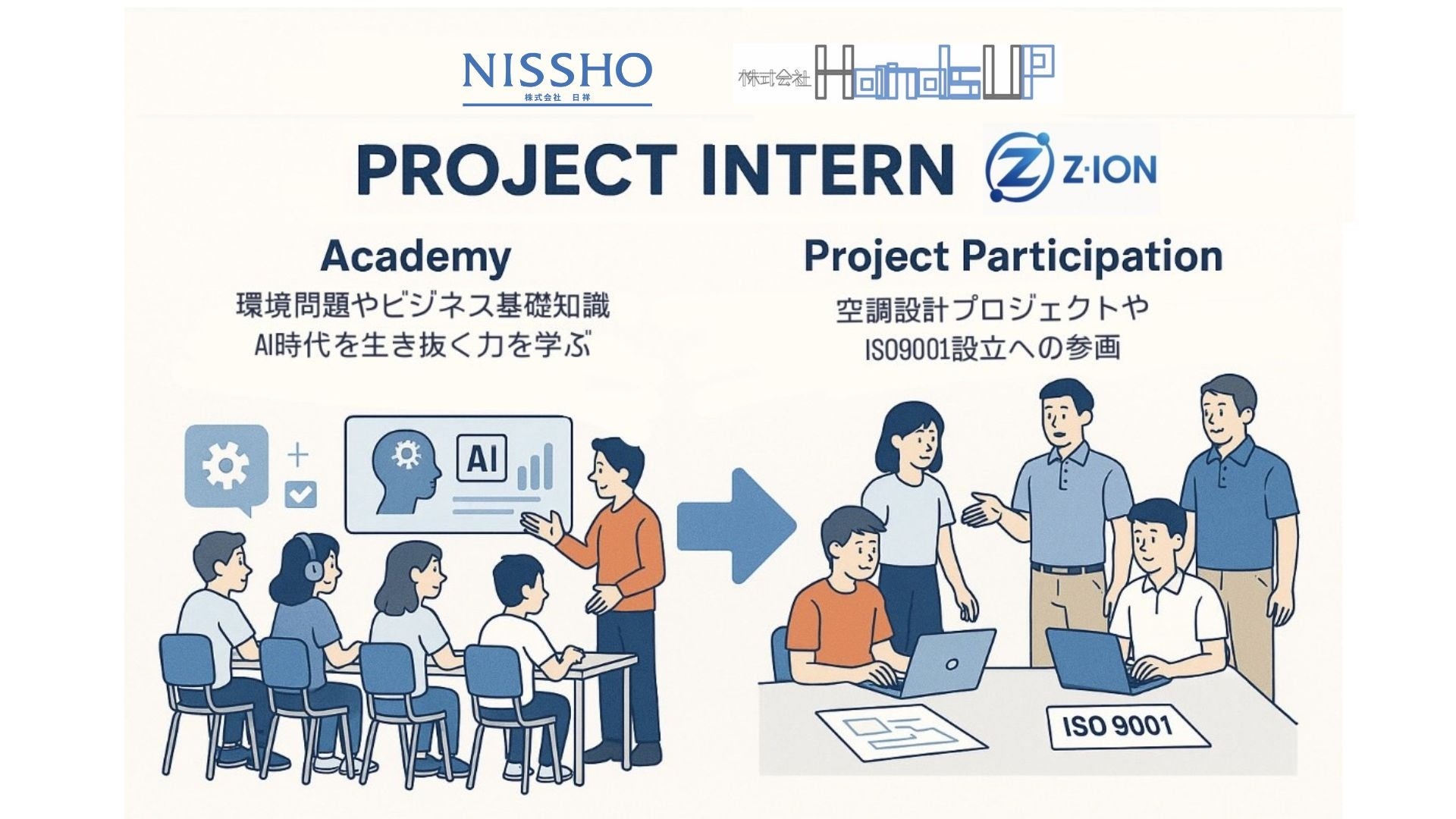 『ZION』は、Z世代の学生と株式会社日祥が共創する、プロジェクトベースの次世代型インターンシップです。補助的な業務をこなす従来型のインターンとは異なり、学生自らがチームを組んで企業の実課題に取り組む「実践型・共創型インターン」として構成されています。学生は、社会人に求められるビジネス感覚やAI時代を生き抜く力を学びながら、リアルな社会課題と向き合うことで、自分の成長を実感し、企業はZ世代の柔軟な発想や行動力を新たな価値として取り入れることができます。