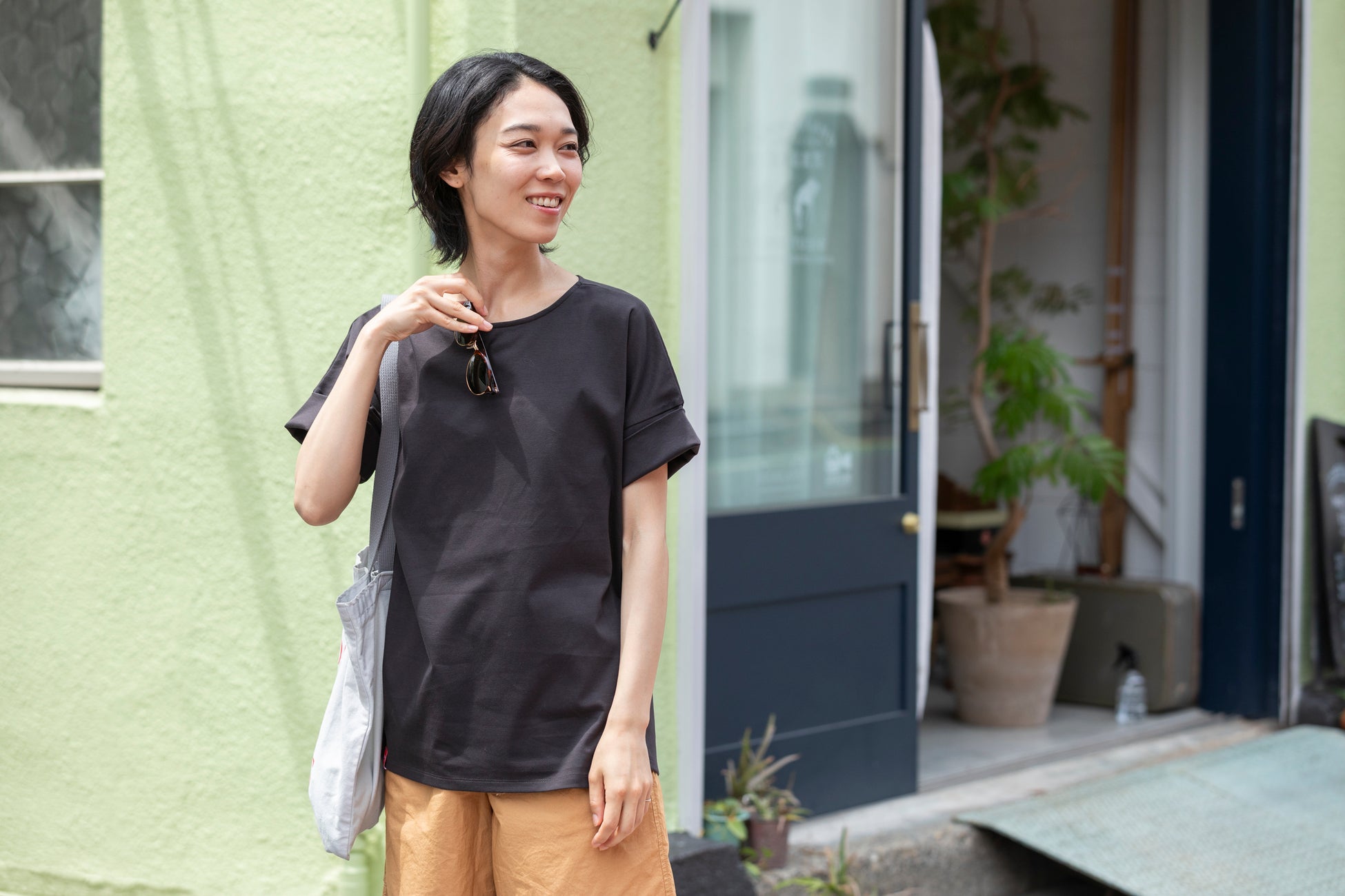 天然素材の優しさ(綿)と機能性(ポリエステル)を組み合わせた、Makuake先行販売のフレンチスリーブシャツ。